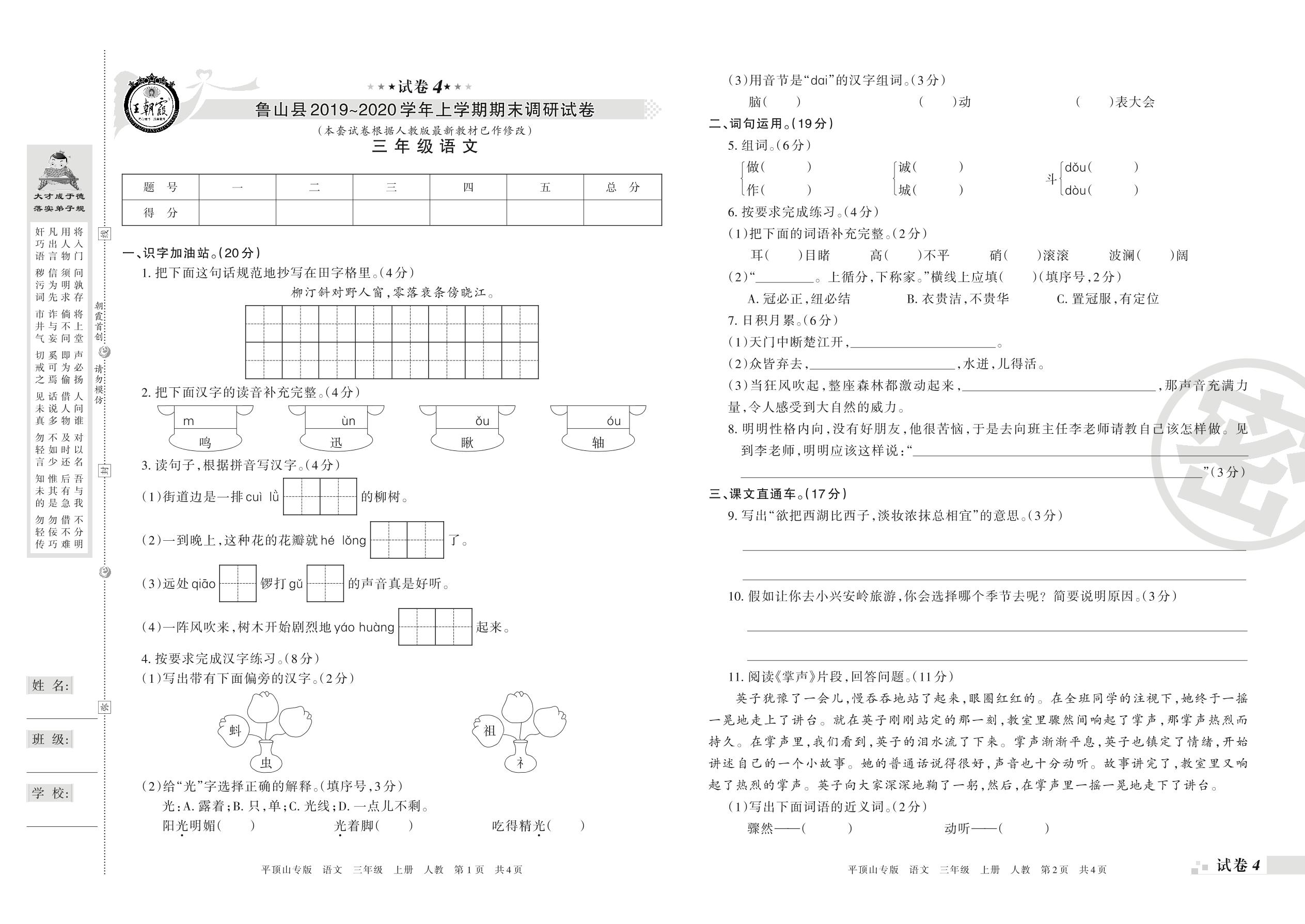 2019-2020学年第一学期平顶山市鲁山县三年级语文试卷(人教版)【4】