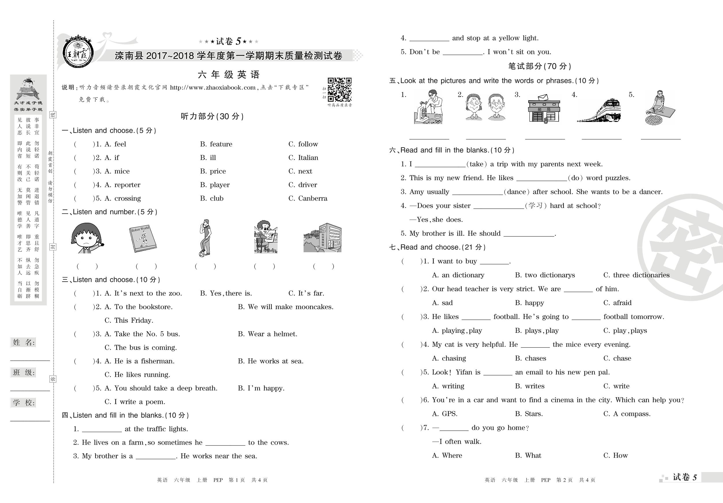 2017-2018学年第一学期唐山市滦南县六年级英语试卷(PEP版)【5】