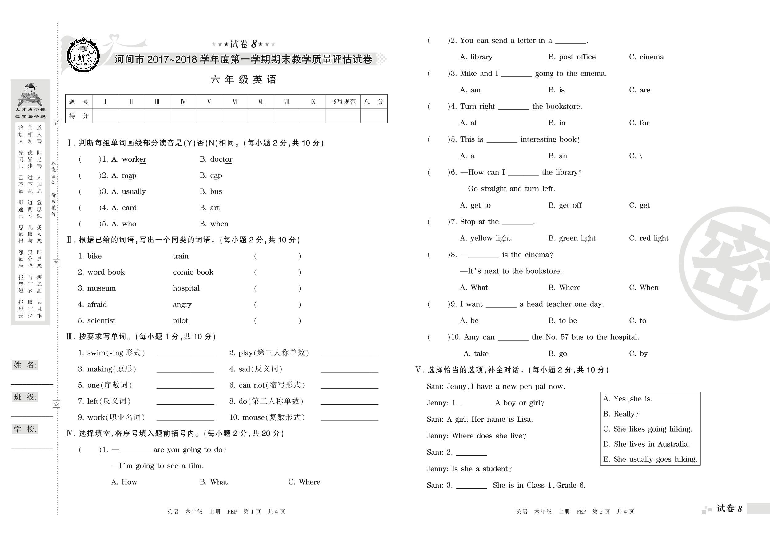 2017-2018学年第一学期河间市六年级英语试卷(PEP版)【8】