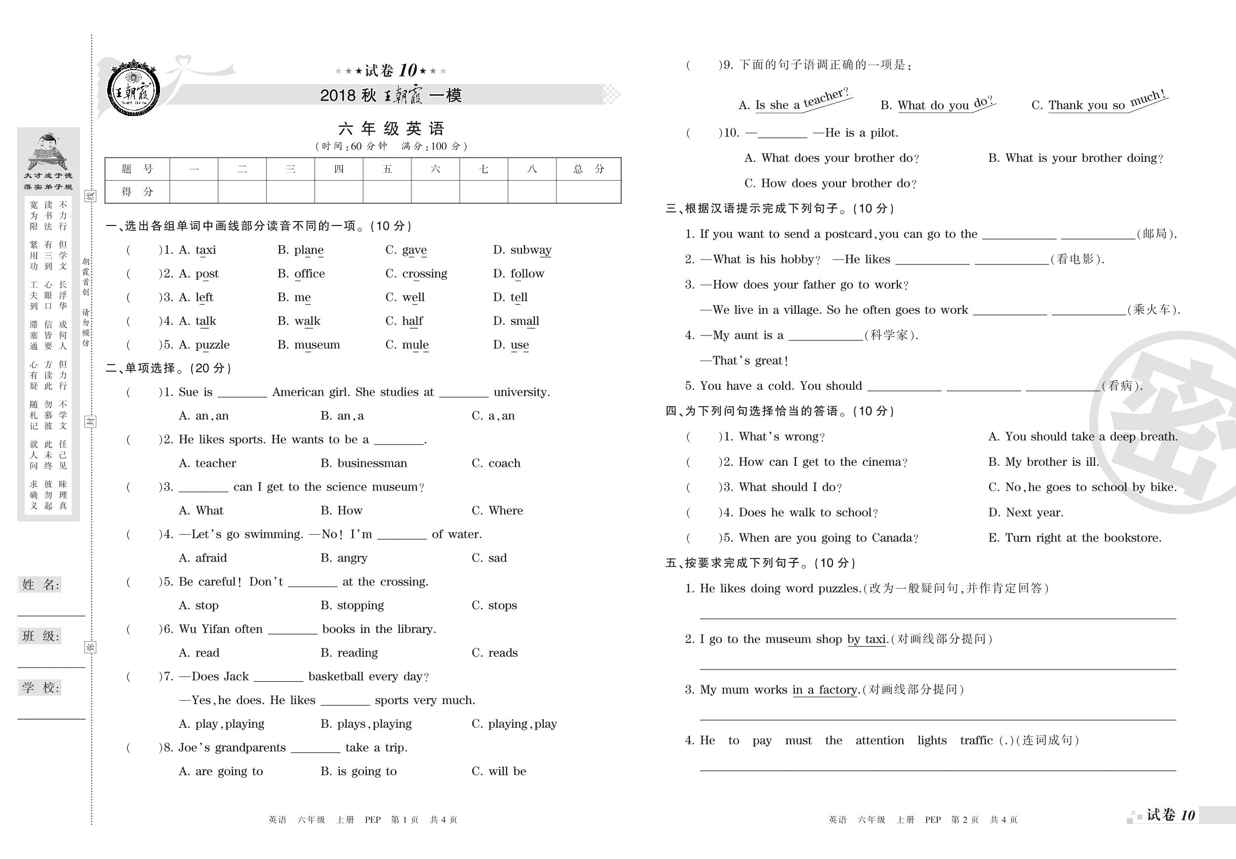 王朝霞期末模拟卷六年级上册英语(PEP版)_R210807172835【10】