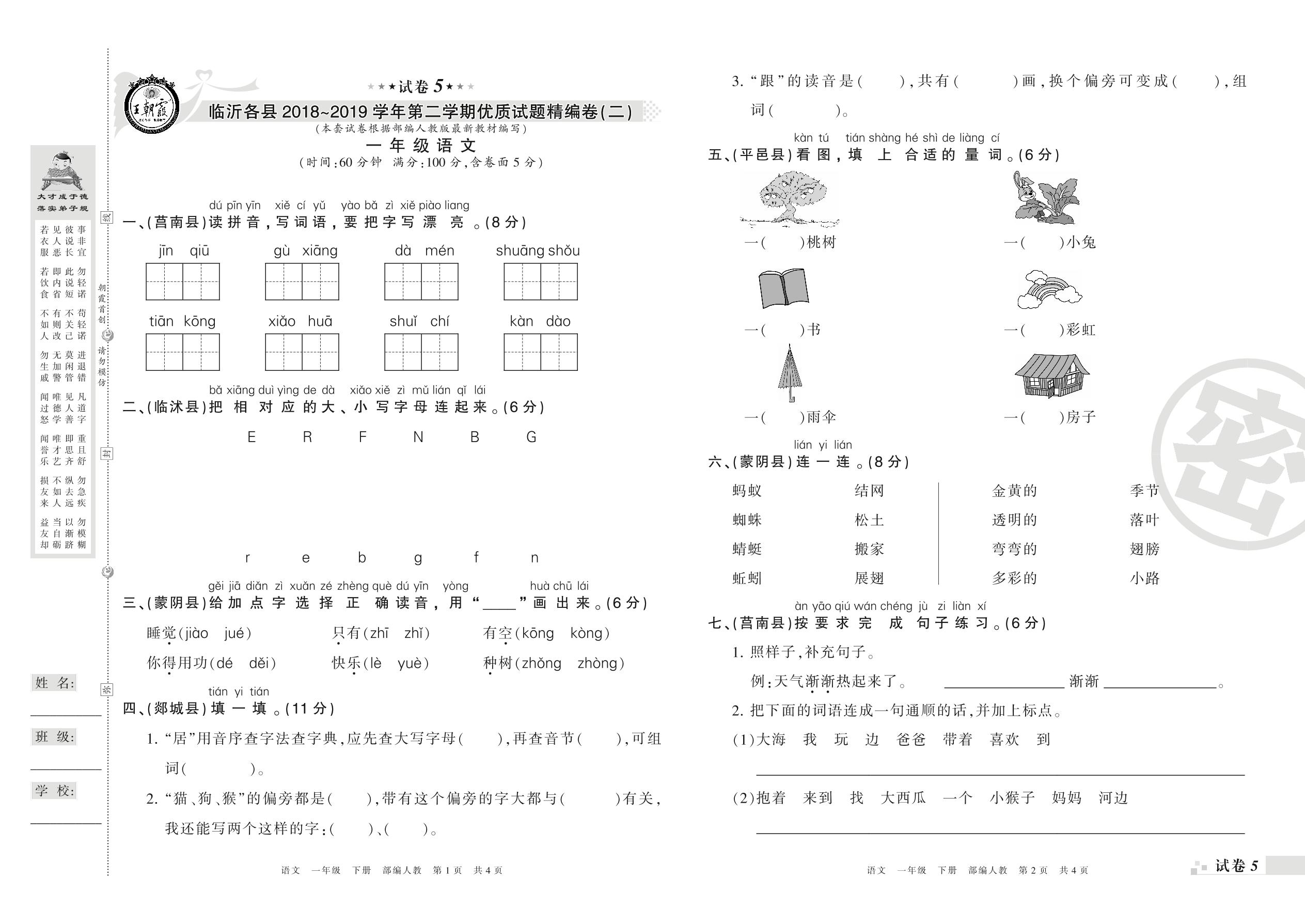 2018-2019学年第二学期临沂各县优质试题精编卷(二)一年级语文试卷(人教版)_R210731175447【5】