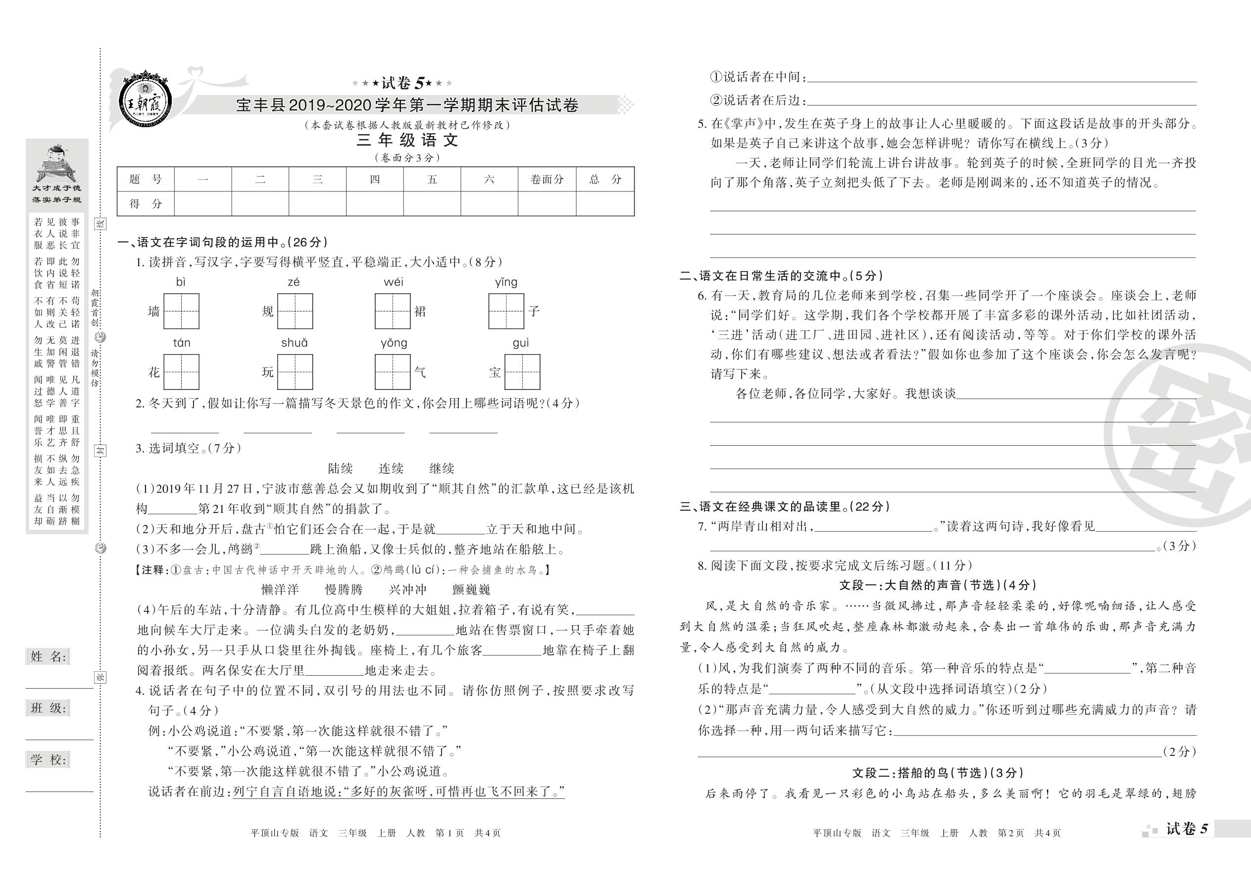 2019-2020学年第一学期平顶山市宝丰县三年级语文试卷(人教版)【5】