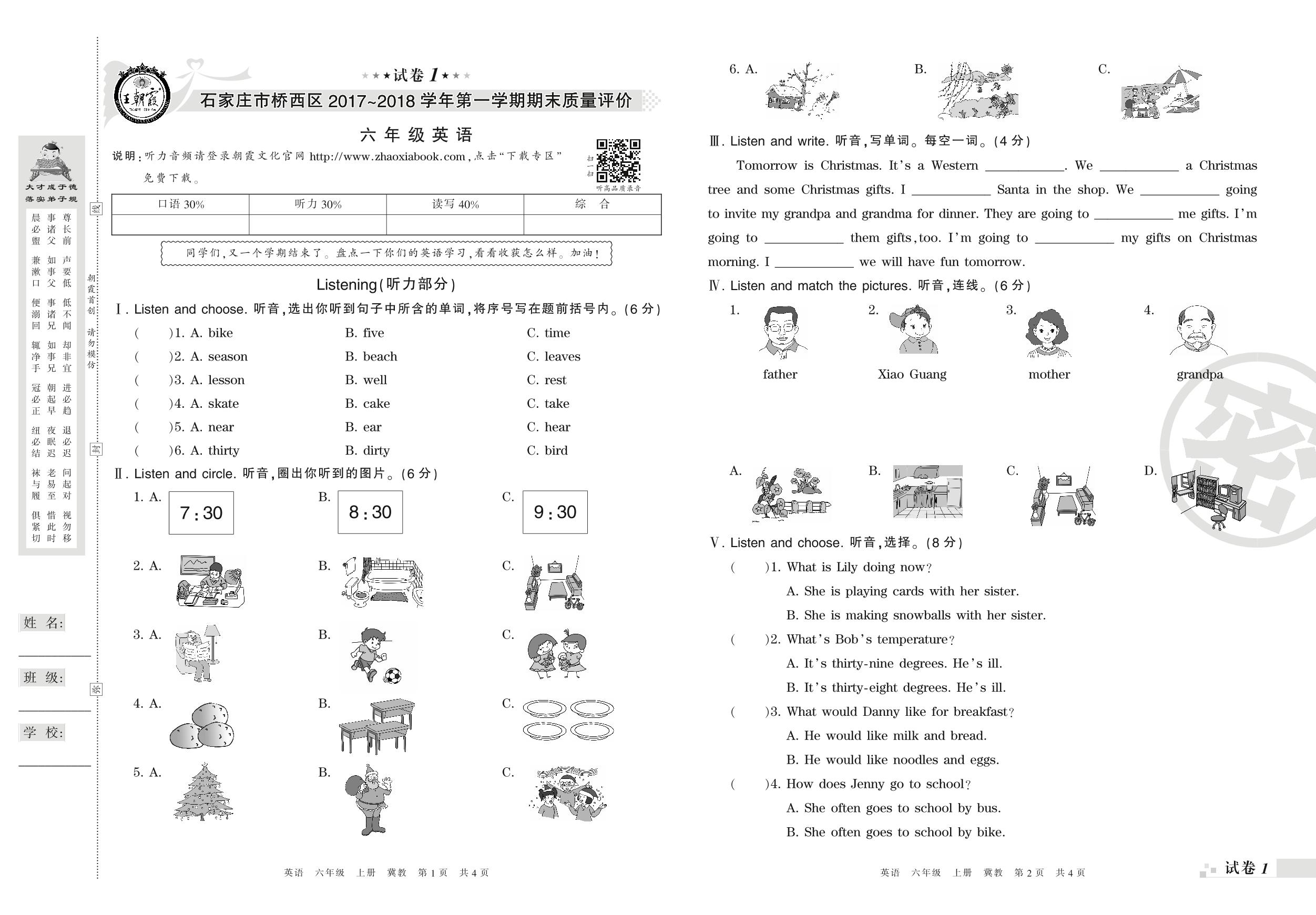 2017-2018学年第一学期石家庄市桥西区六年级英语试卷(冀教版)【1】