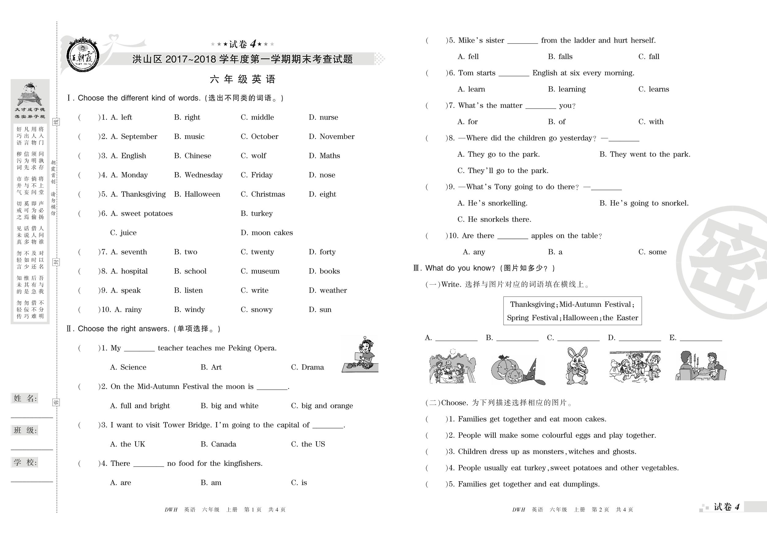 2017-2018学年第一学期武汉市洪山区六年级英语试卷(剑桥版)【4】