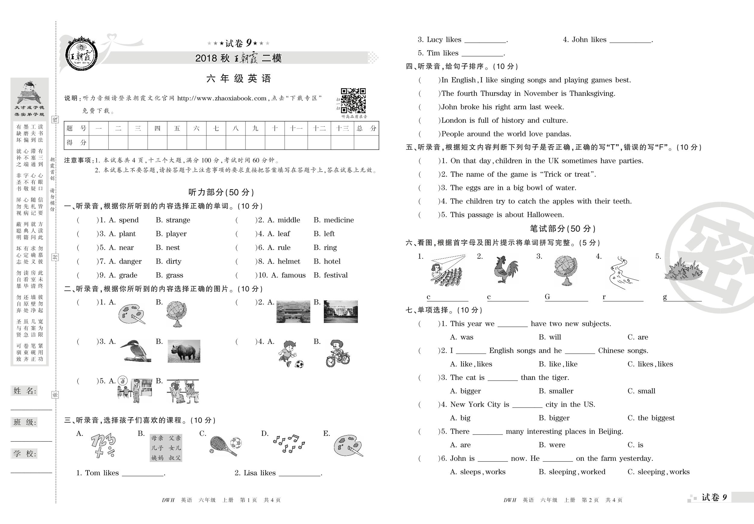 王朝霞期末模拟卷六年级上册英语(剑桥版)_R210807173052【9】