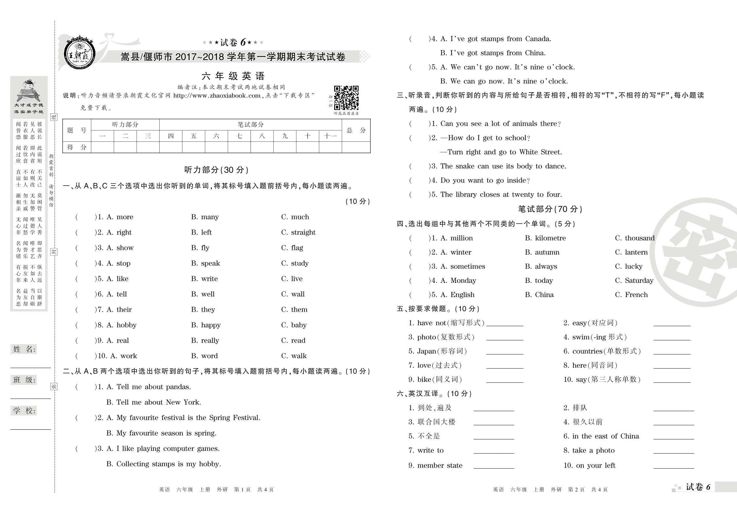 2017-2018学年第一学期嵩县(偃师市)六年级英语试卷(外研版)【6】