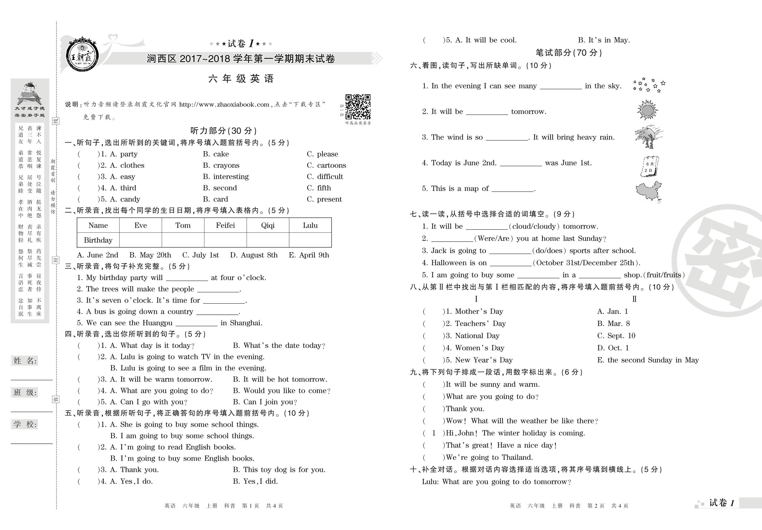 2017-2018学年第一学期洛阳市涧西区六年级英语试卷(科普版)【1】