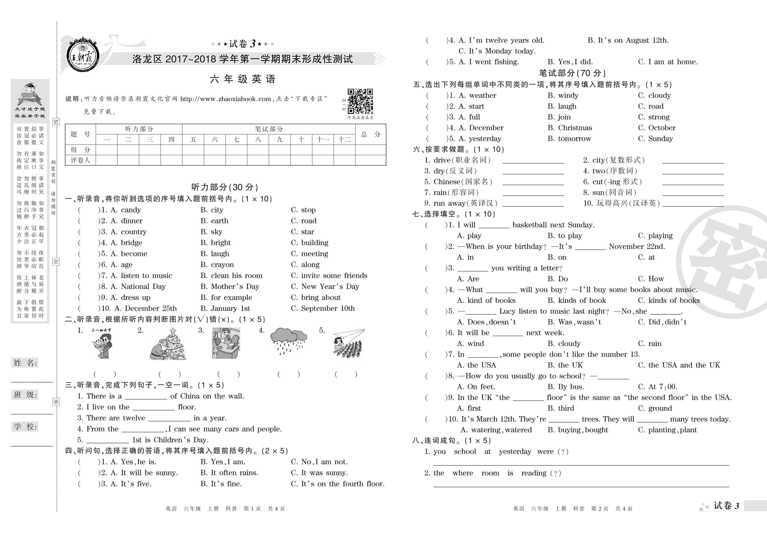 2017-2018学年第一学期洛阳市洛龙区六年级英语试卷(科普版)【3】