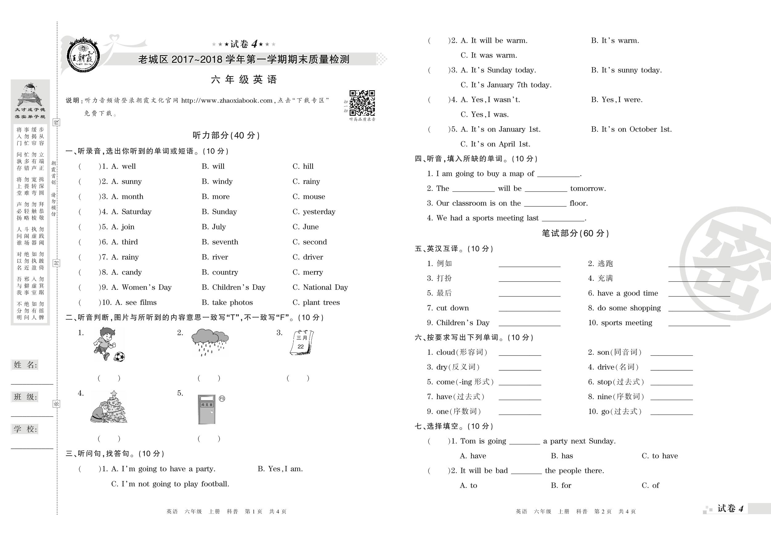 2017-2018学年第一学期洛阳市老城区六年级英语试卷(科普版)【4】