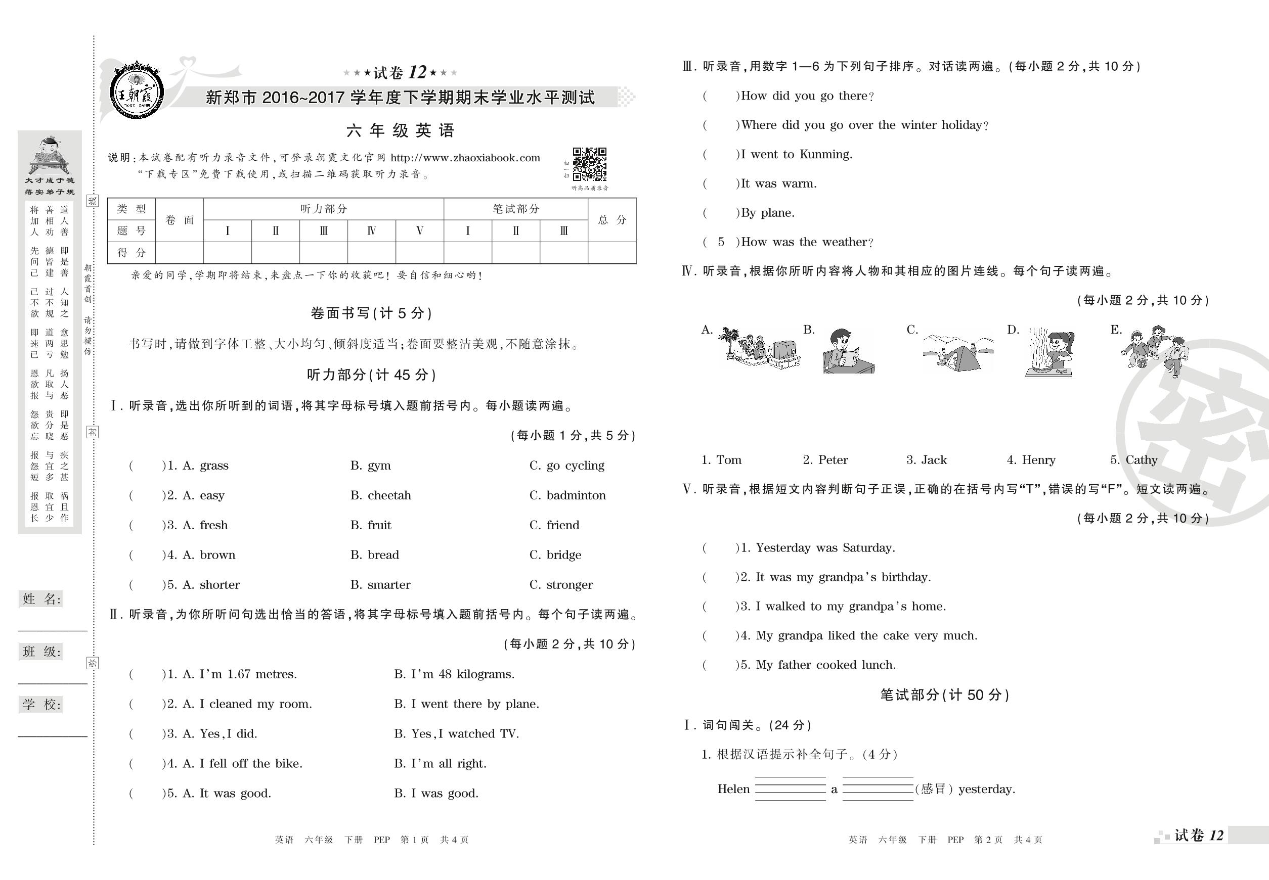 2016-2017学年第二学期新郑市六年级英语试卷(PEP版)【12】