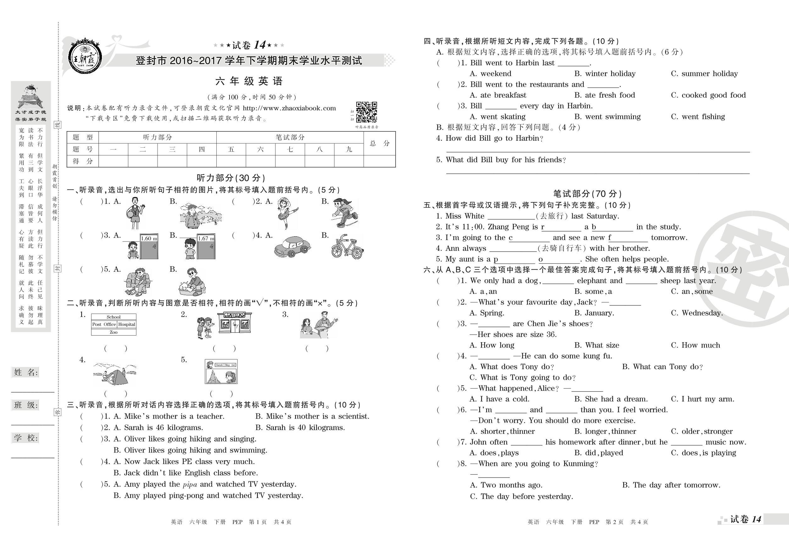 2016-2017学年第二学期登封市六年级英语试卷(PEP版)【14】