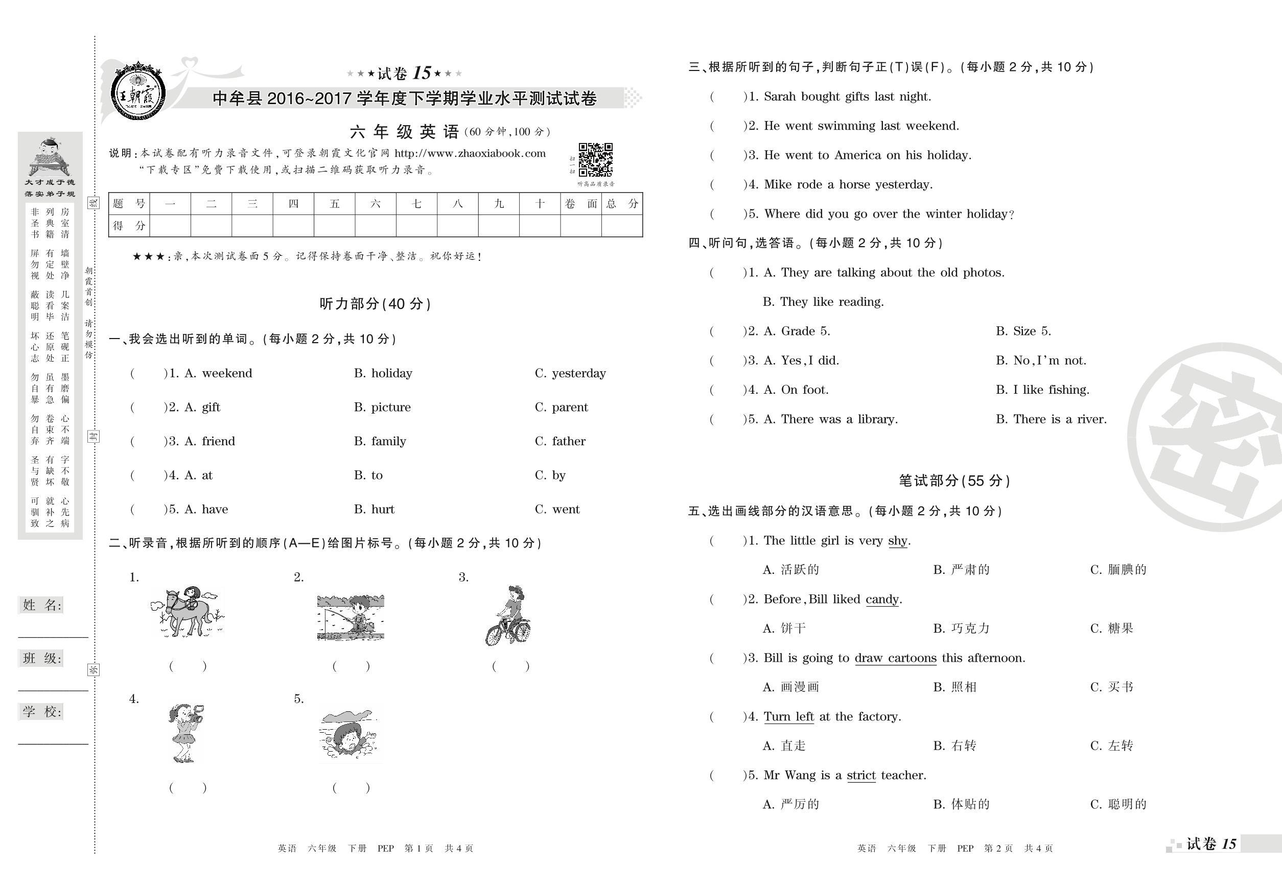 2016-2017学年第二学期郑州市中牟县六年级英语试卷(PEP版)【15】