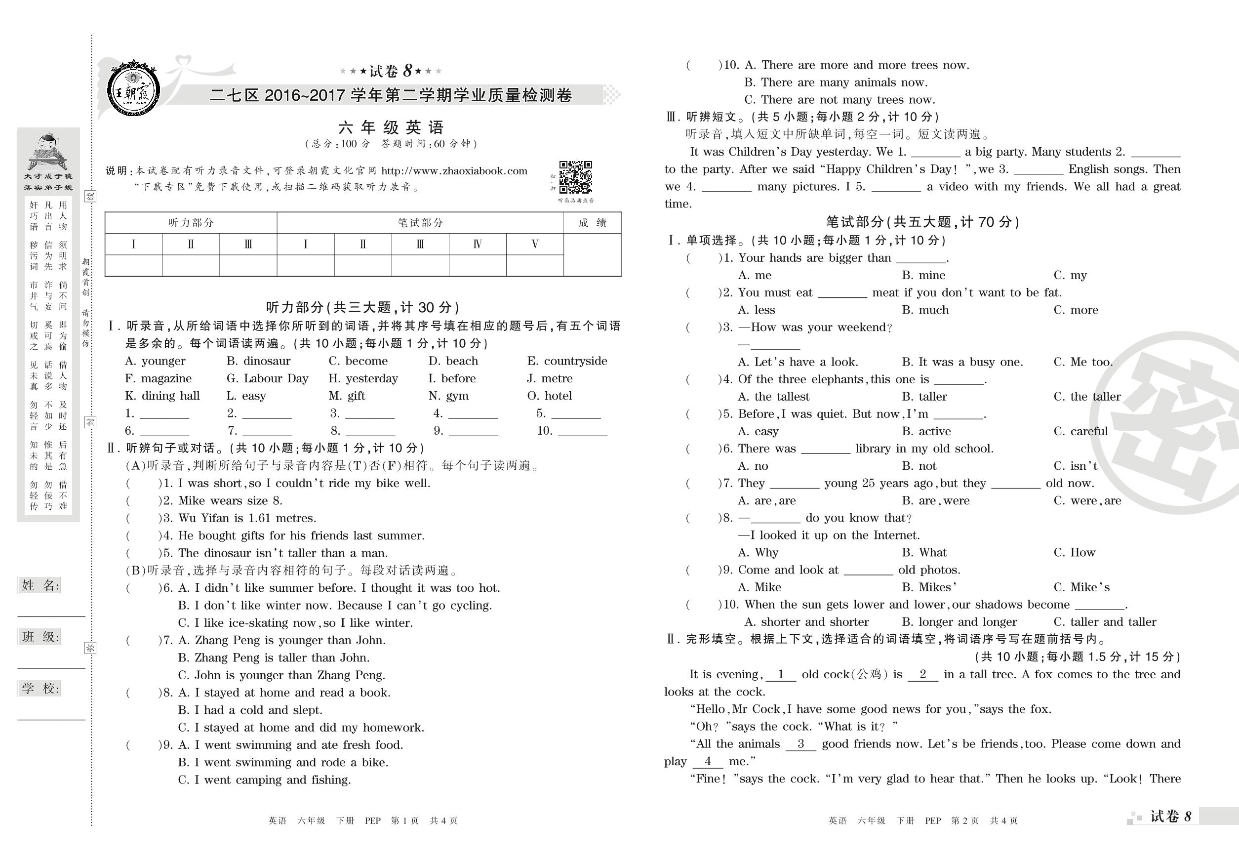 2016-2017学年第二学期郑州市二七区六年级英语试卷(PEP版)【8】