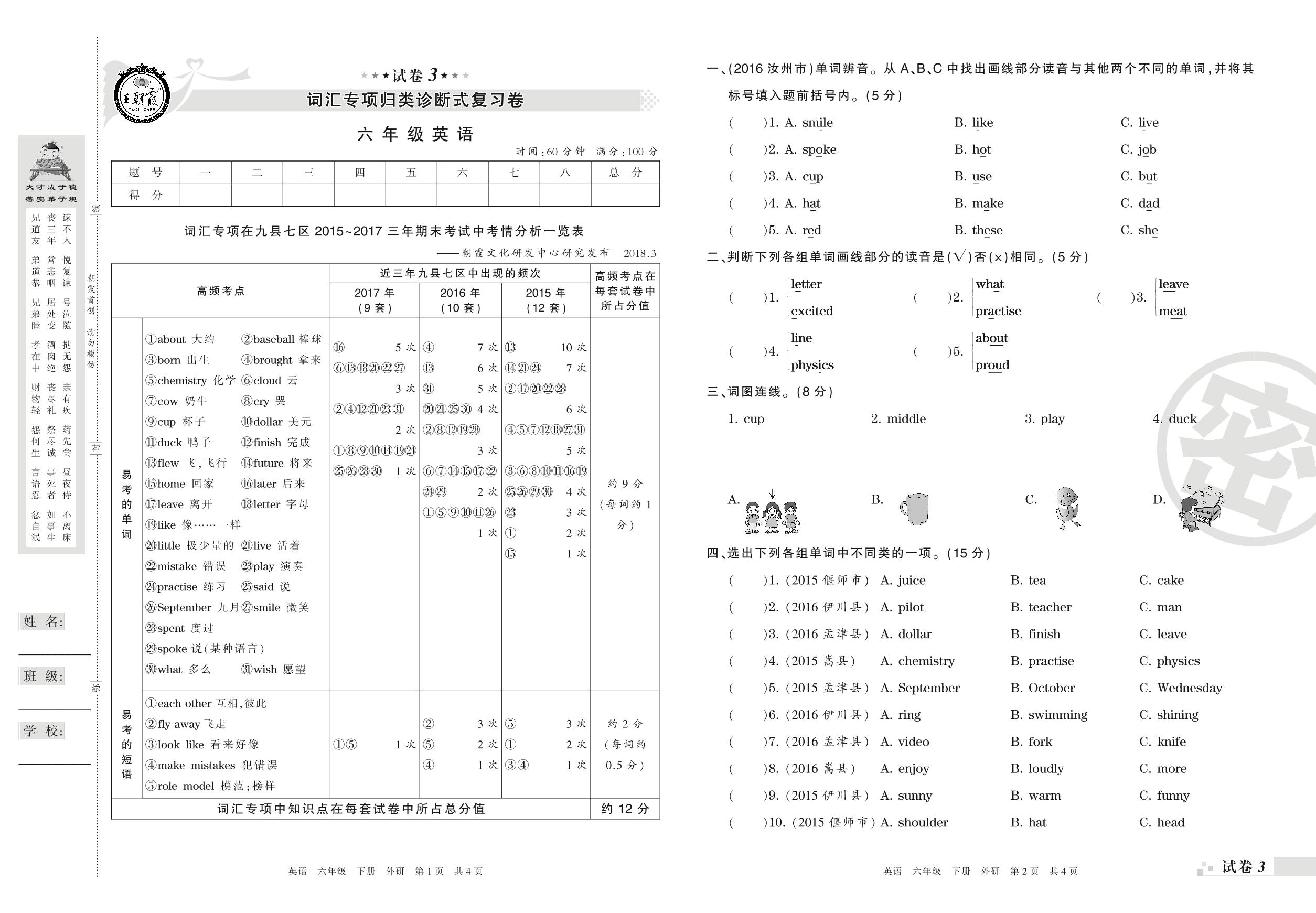 王朝霞期末专项卷——词汇专项归类诊断式复习卷六年级下册英语(外研版)【3】