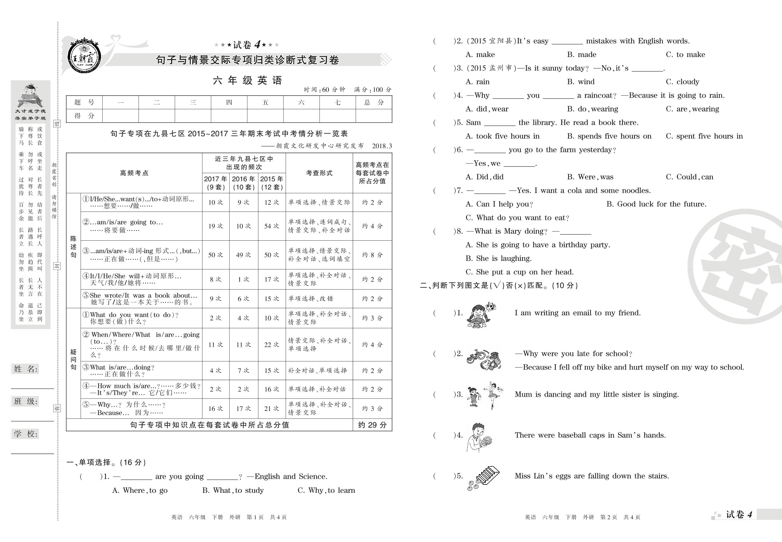 王朝霞期末专项卷——句子与情景交际专项归类诊断式复习卷六年级下册英语(外研版)【4】