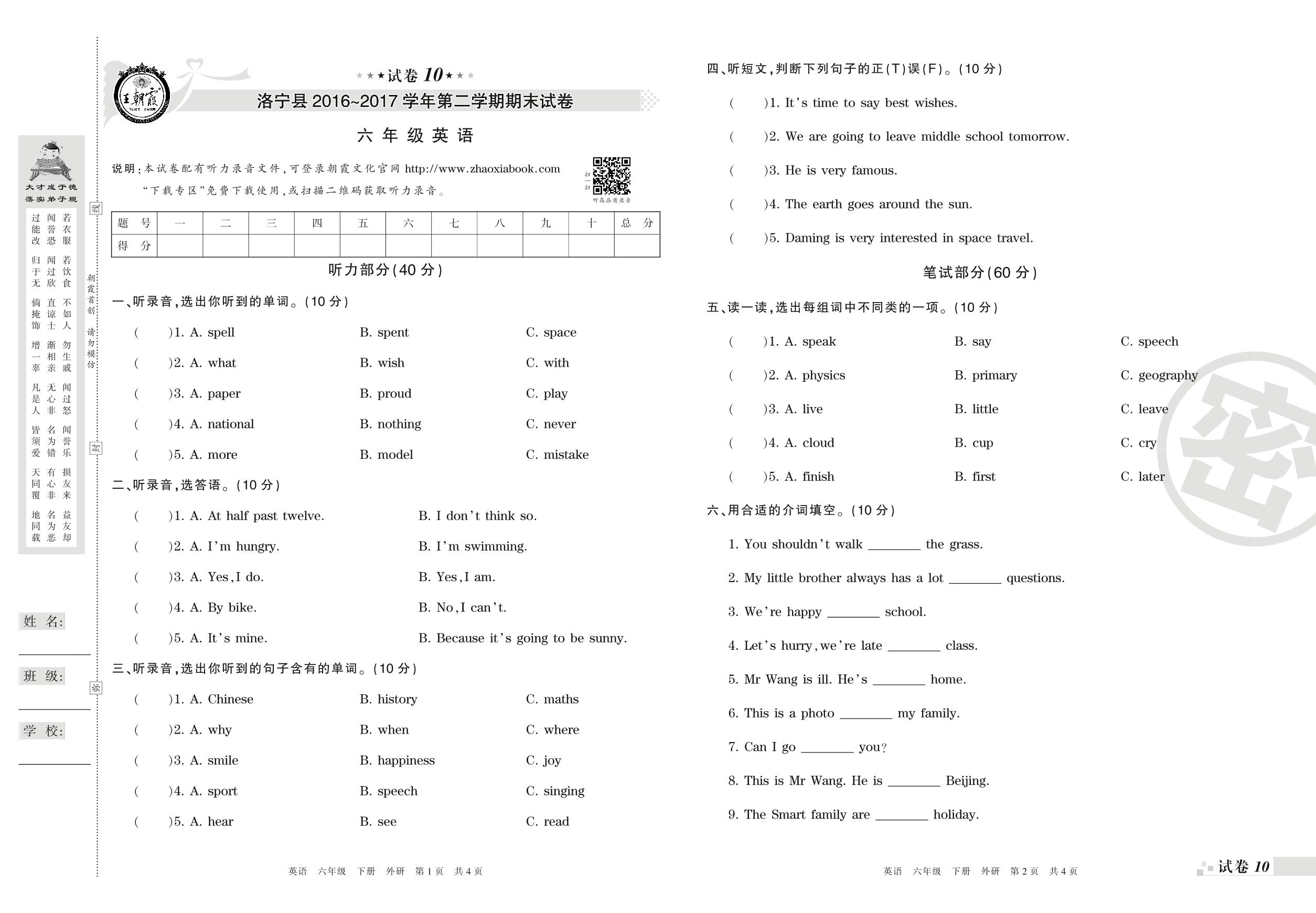 2016-2017学年第二学期洛阳市洛宁县六年级英语试卷(外研版)【10】
