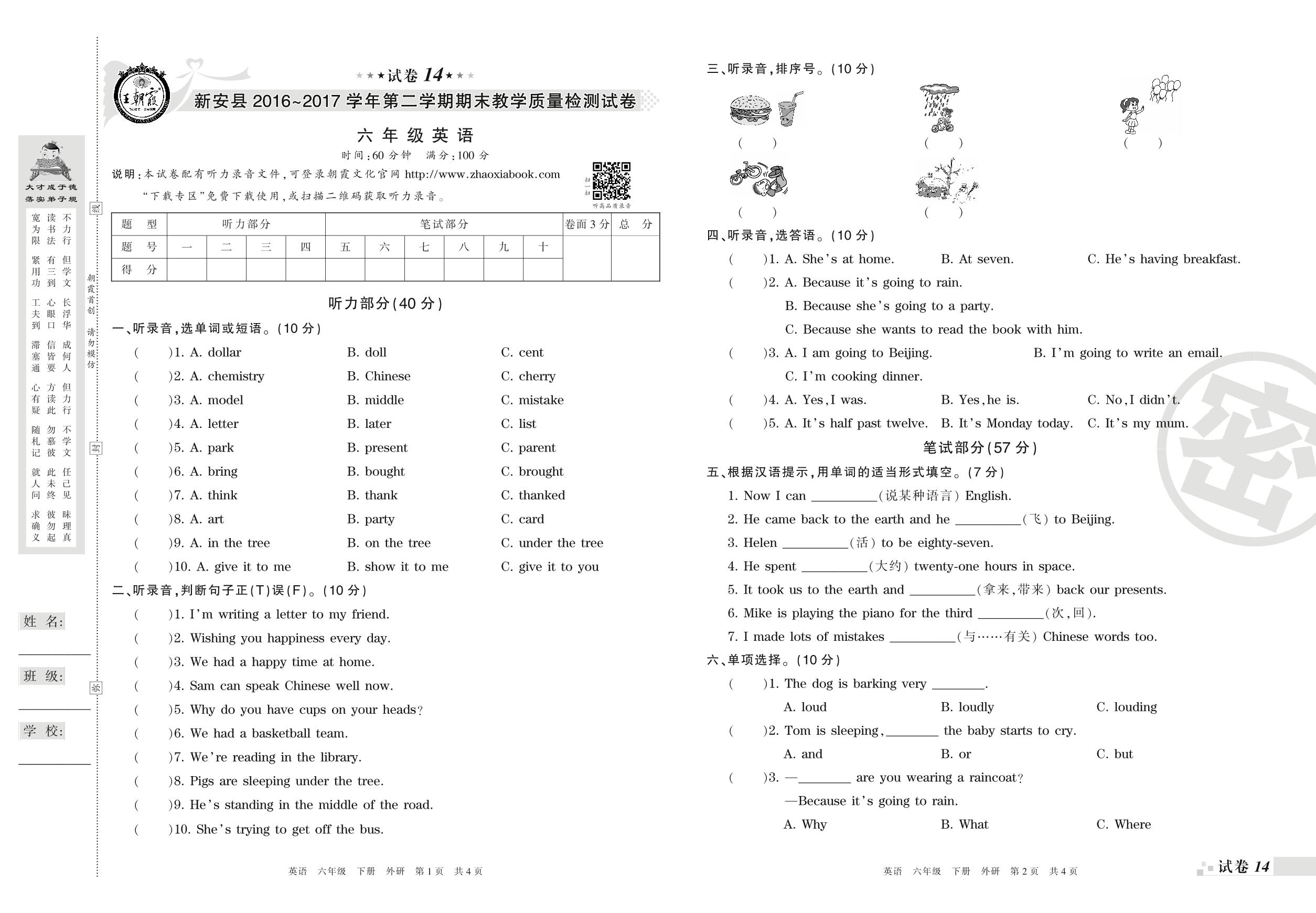 2016-2017学年第二学期洛阳市新安县六年级英语试卷(外研版)【14】