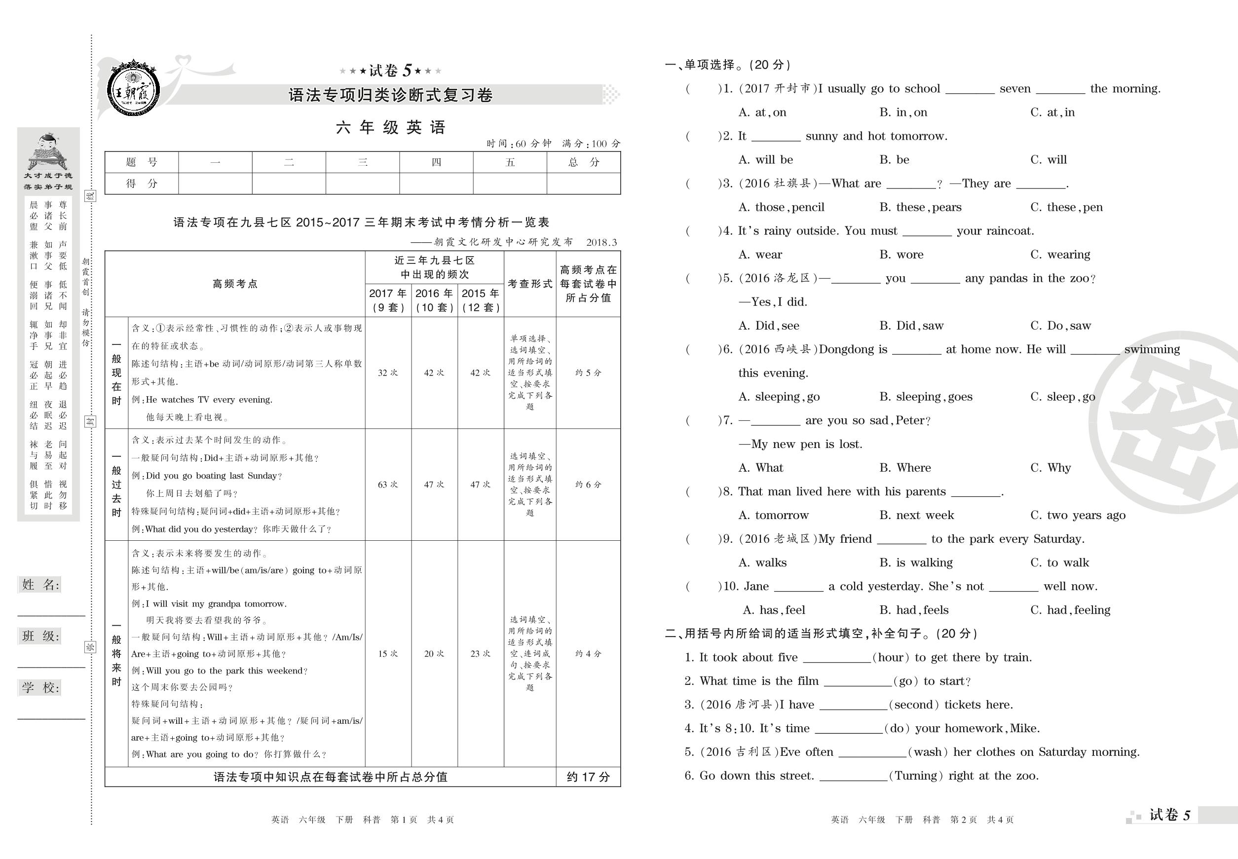 王朝霞期末专项卷——语法专项归类诊断式复习卷六年级下册英语(科普版)【5】