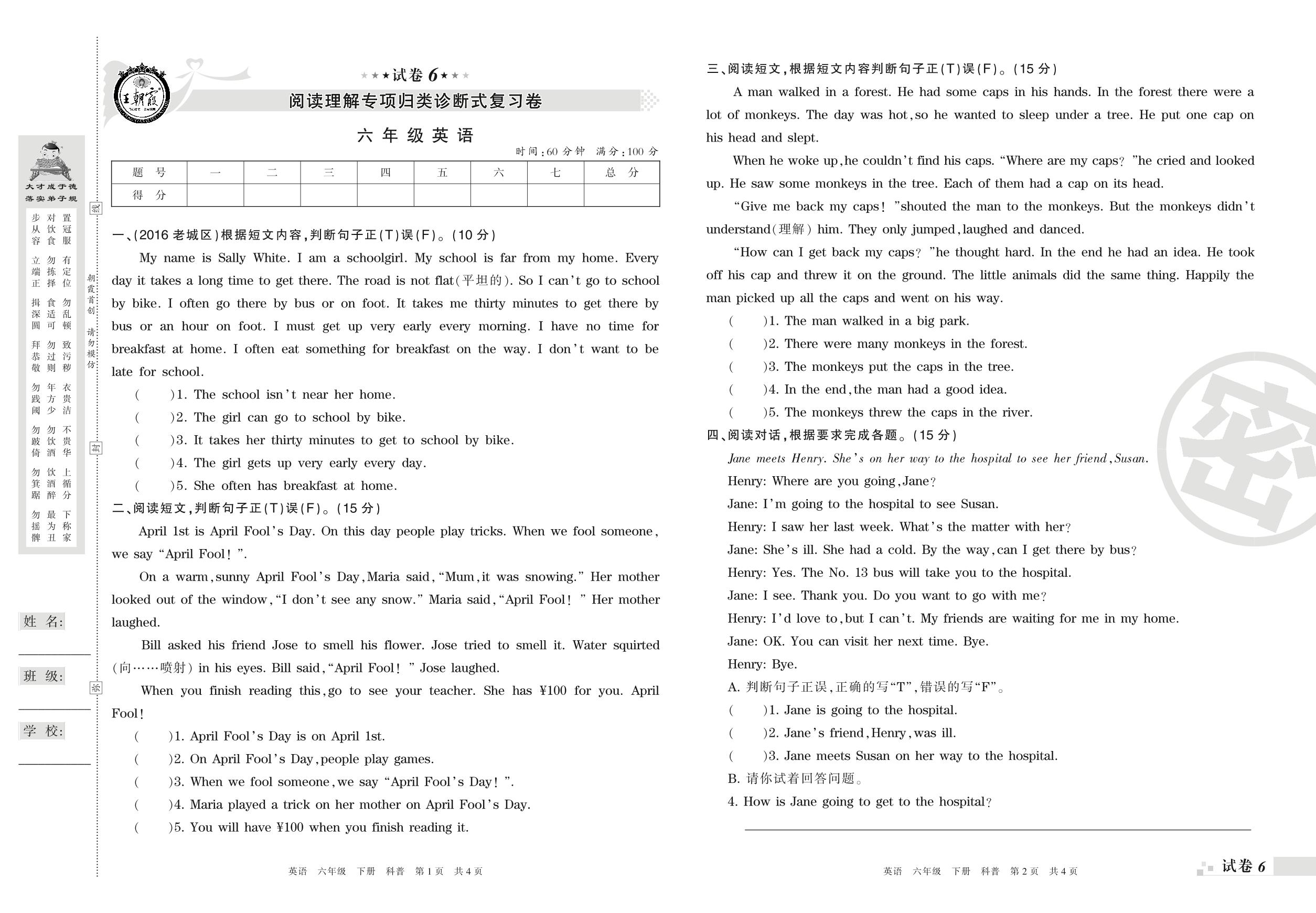 王朝霞期末专项卷——阅读理解专项归类诊断式复习卷六年级下册英语(科普版)【6】
