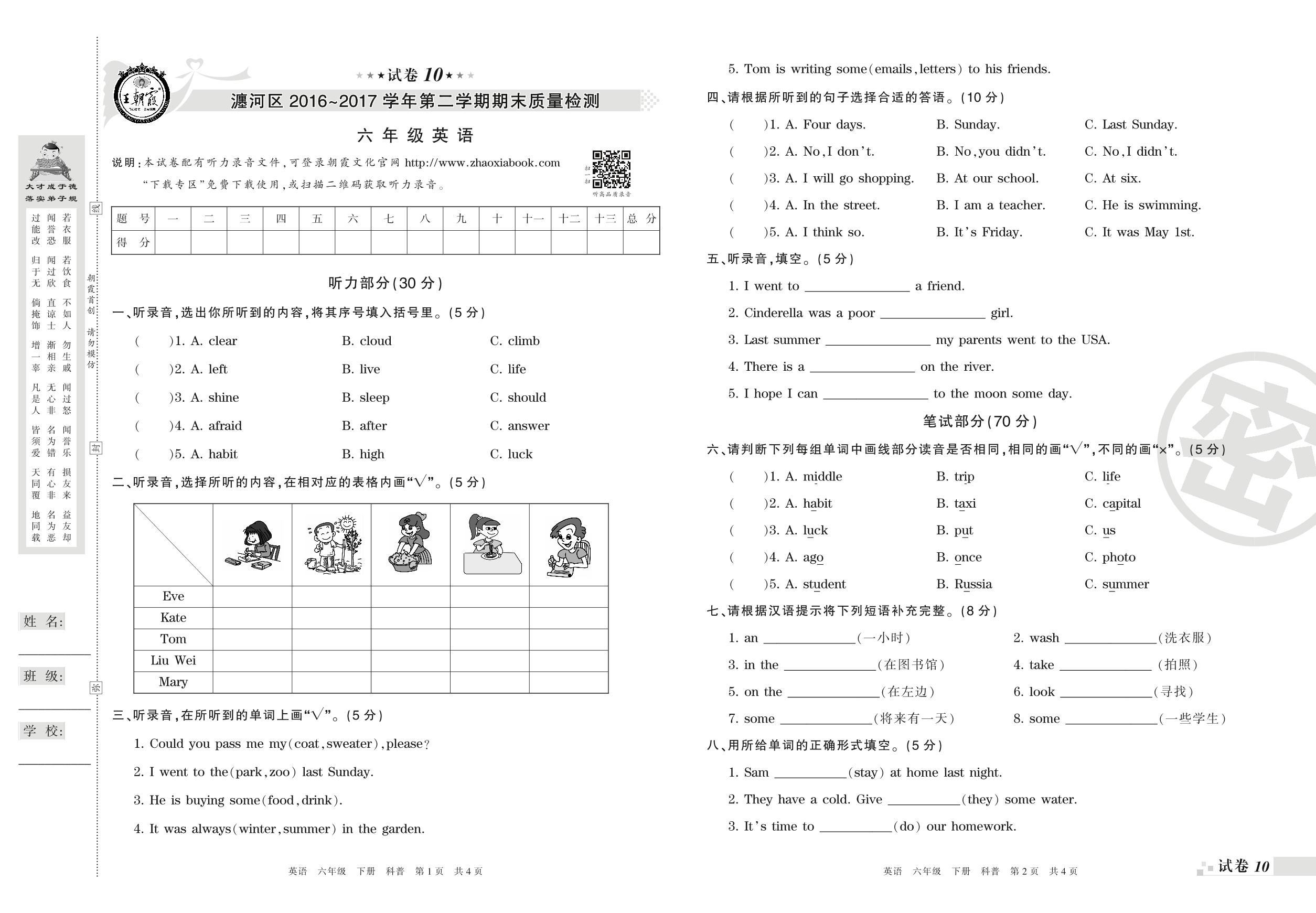 2016-2017学年第二学期洛阳市瀍河区六年级英语试卷(科普版)【10】
