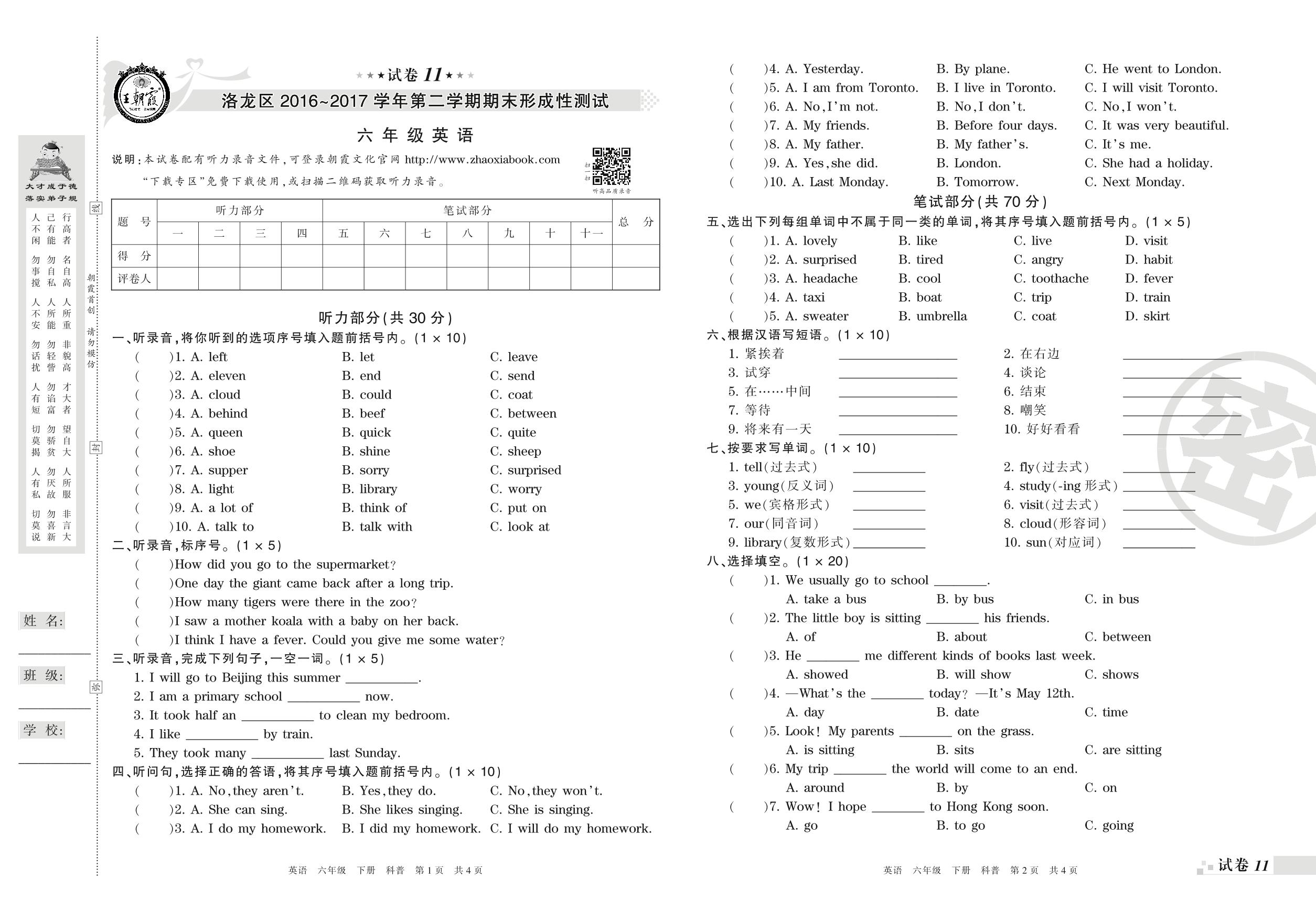 2016-2017学年第二学期洛阳市洛龙区六年级英语试卷(科普版)【11】