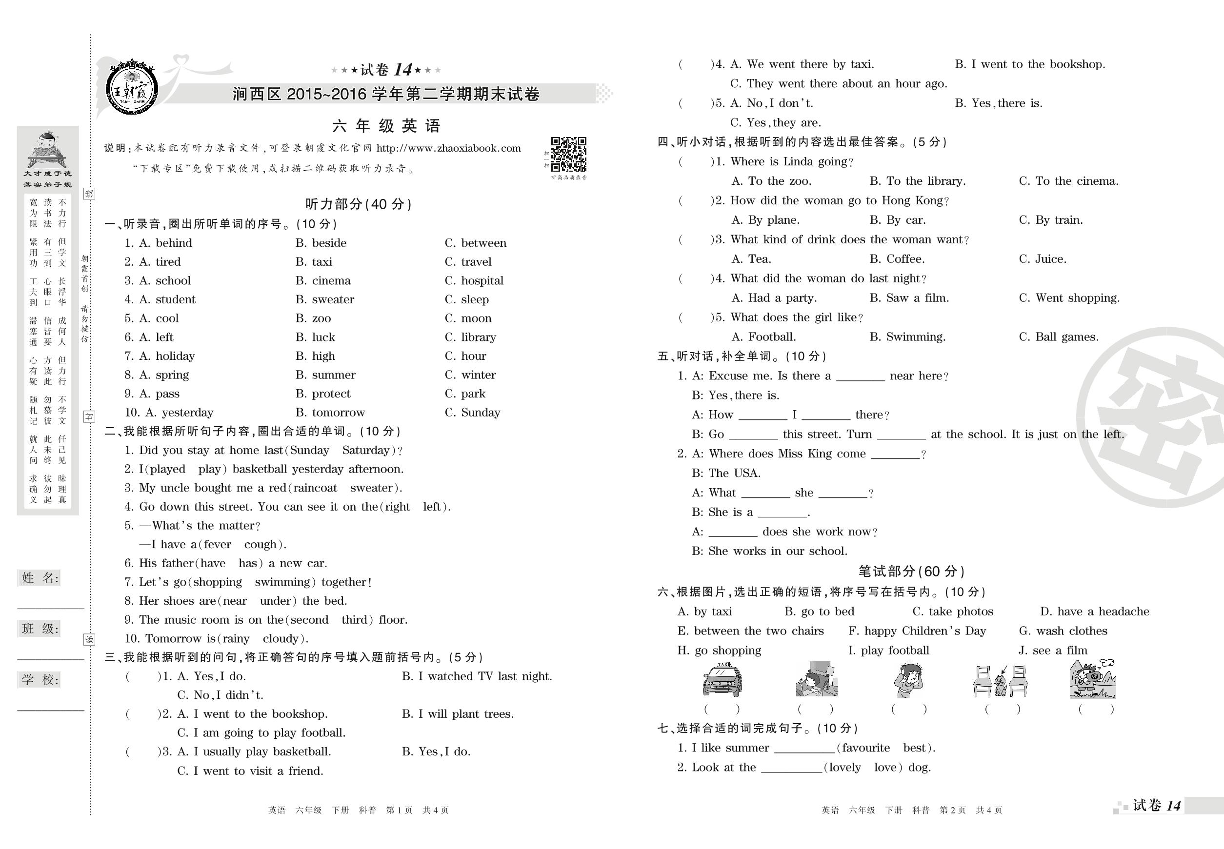 2015-2016学年第二学期洛阳市涧西区六年级英语试卷(科普版)【14】