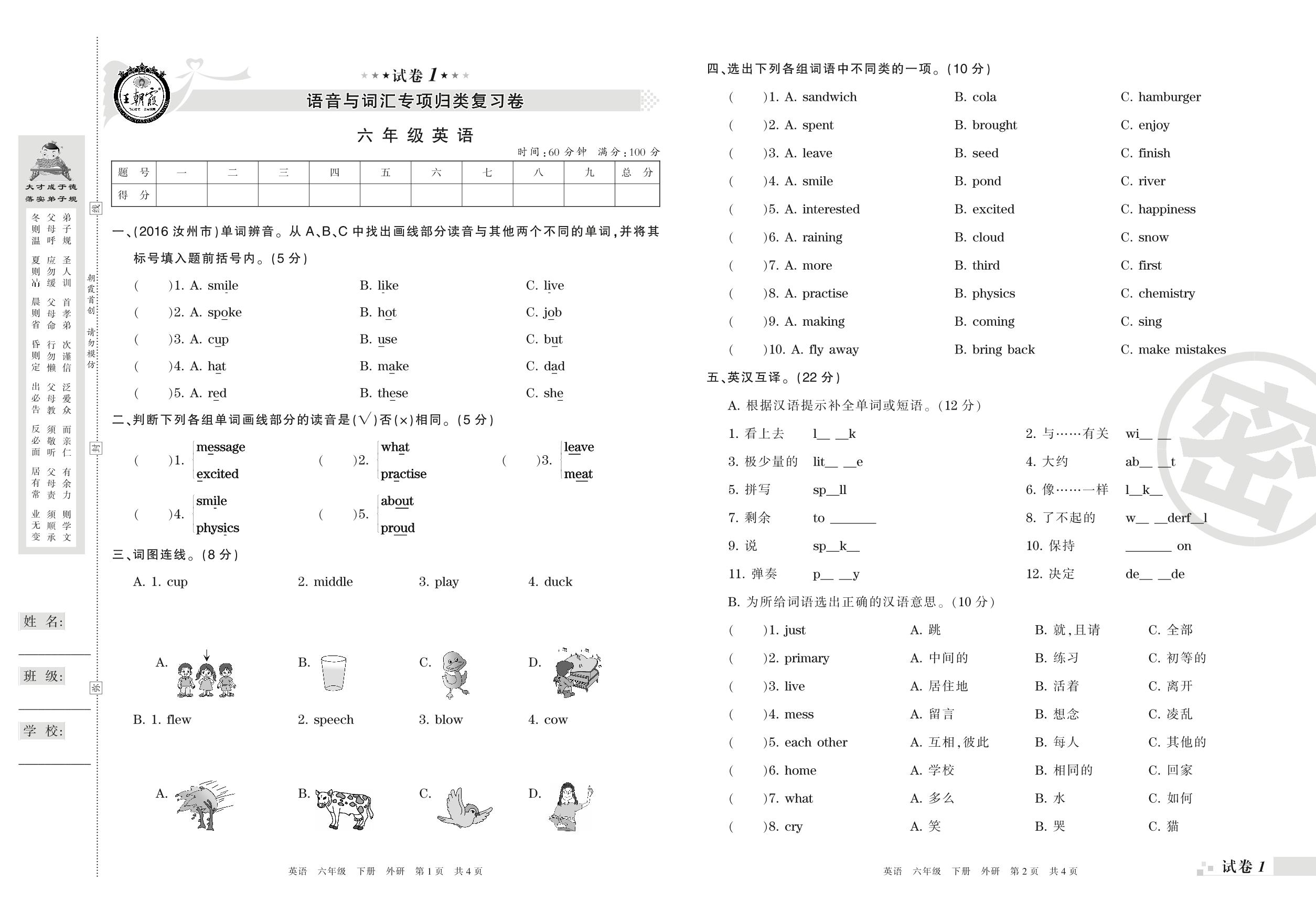 王朝霞期末专项卷——语音与词汇专项归类复习卷六年级下册英语(外研版)【1】