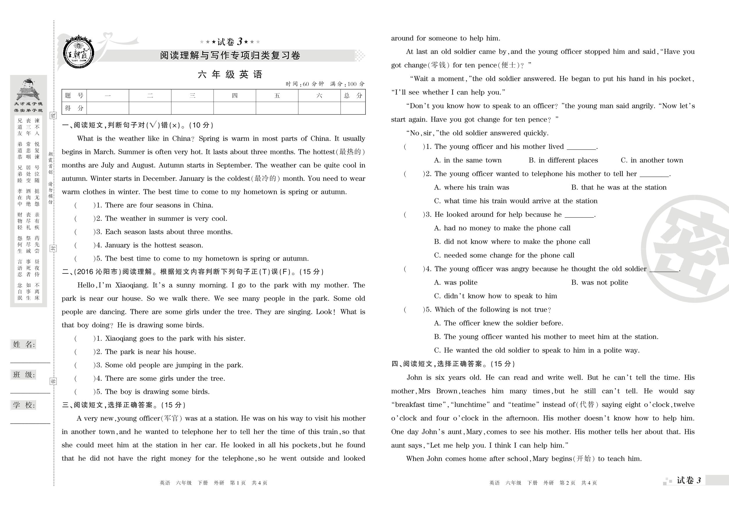 王朝霞期末专项卷——阅读理解与写作专项归类复习卷六年级下册英语(外研版)【3】
