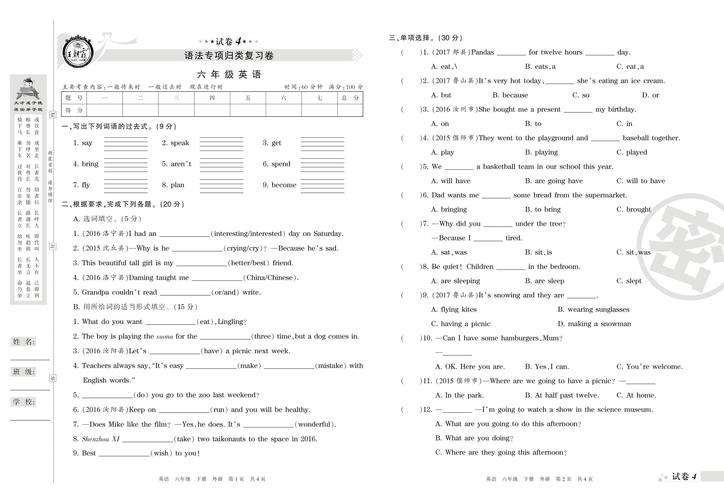 王朝霞期末专项卷——语法专项归类复习卷六年级下册英语(外研版)【4】