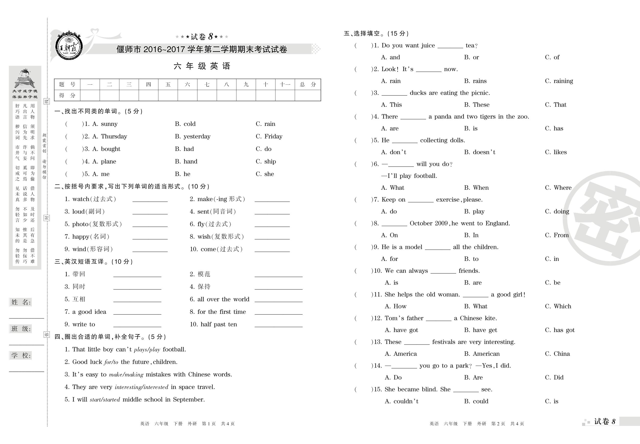 2016-2017学年第二学期偃师市六年级英语试卷(外研版)【8】