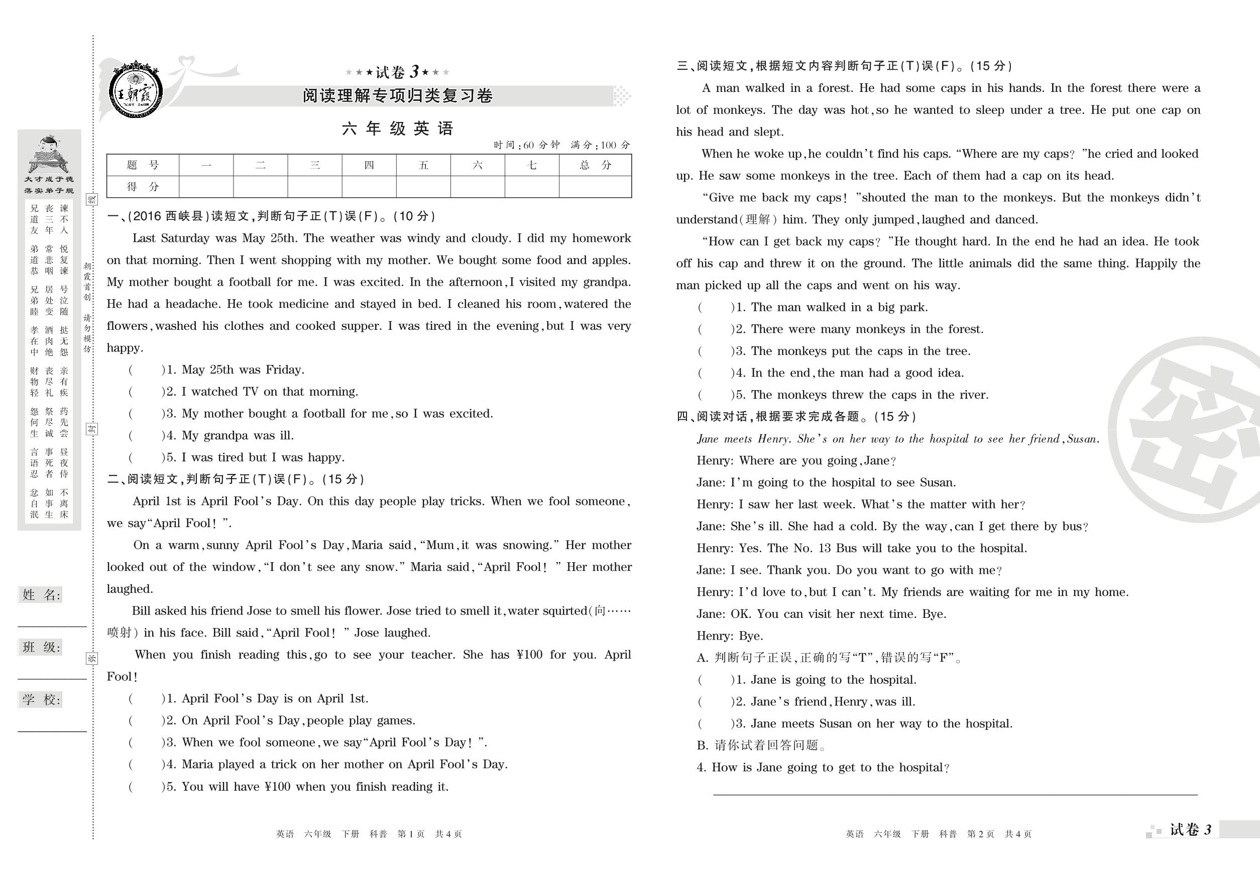 王朝霞期末专项卷——阅读理解与写作专项归类复习卷六年级下册英语(科普版)【3】