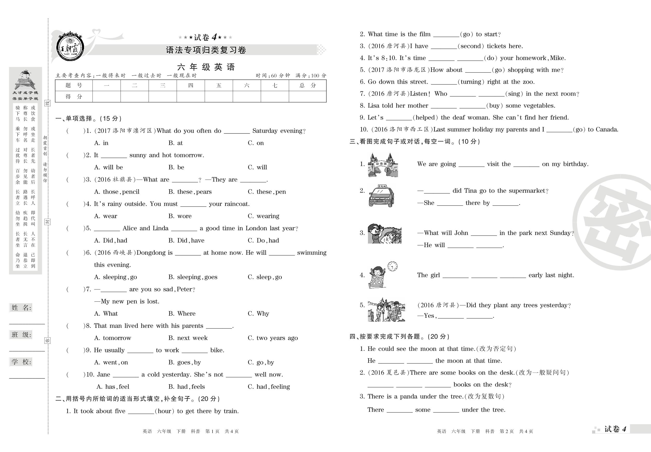 王朝霞期末专项卷——语法专项归类复习卷六年级下册英语(科普版)【4】