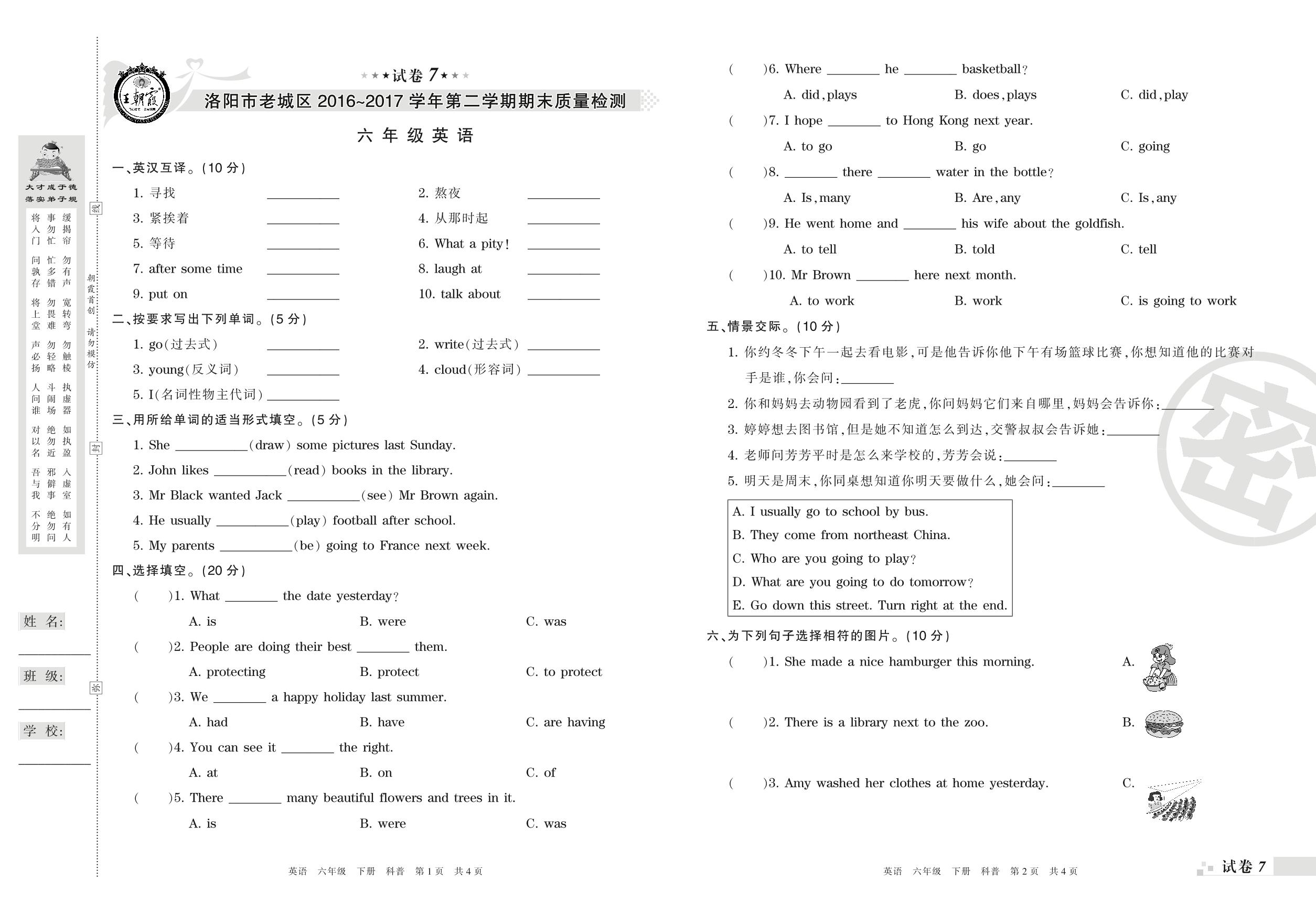 2016-2017学年第二学期洛阳市老城区六年级英语试卷(科普版)【7】