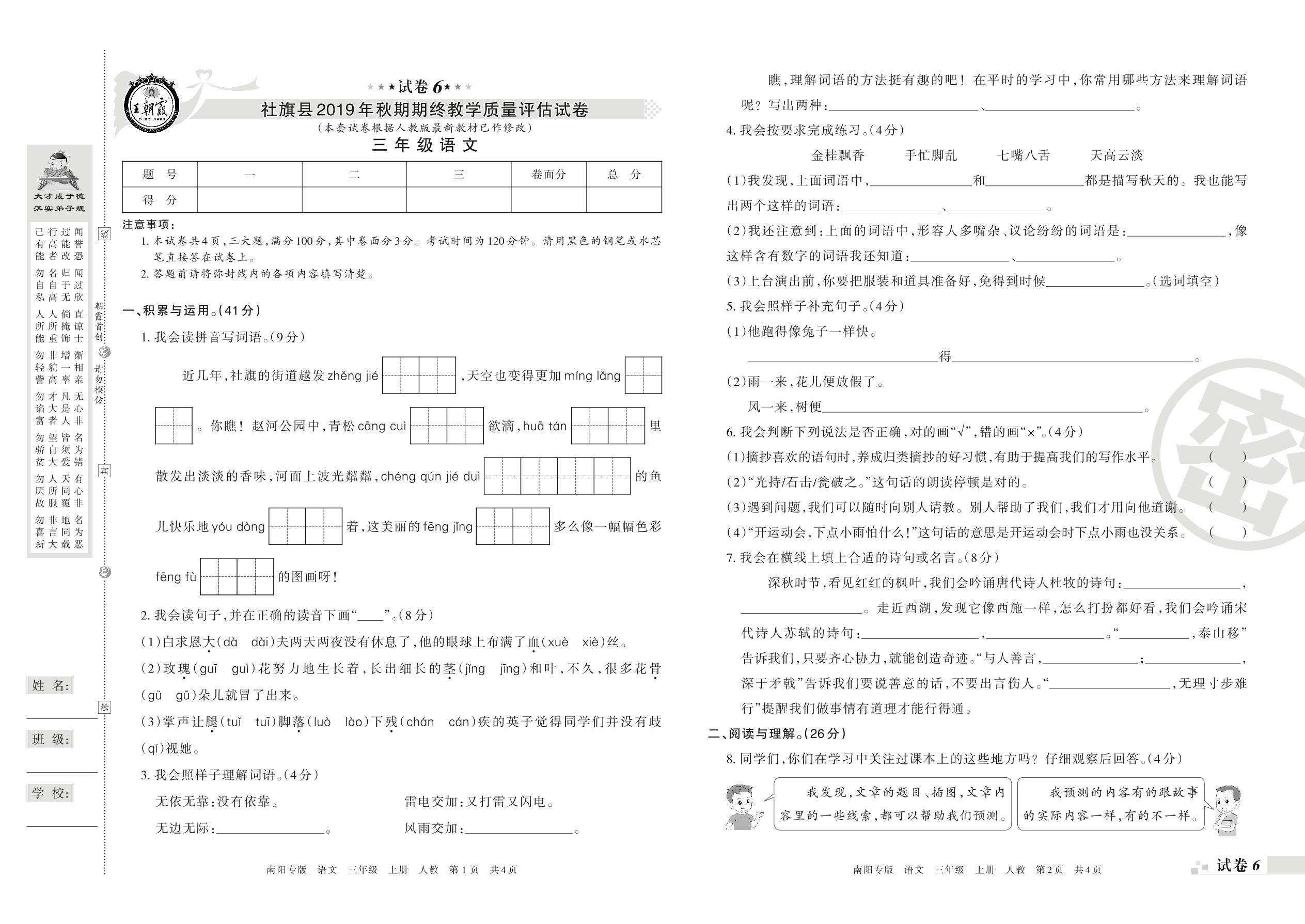 2019-2020学年第一学期南阳市社旗县三年级语文试卷(人教版)【6】