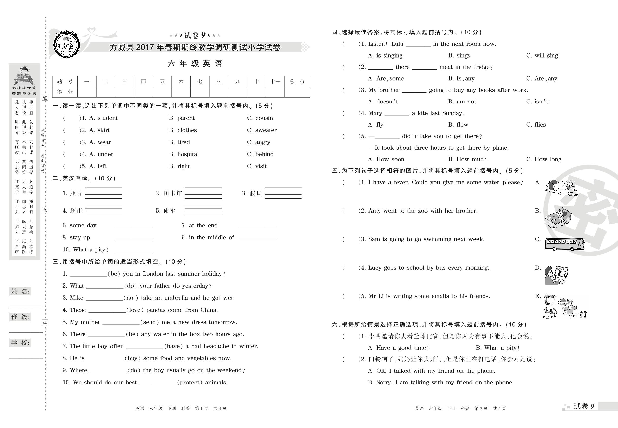 2016-2017学年第二学期南阳市方城县六年级英语试卷(科普版)【9】