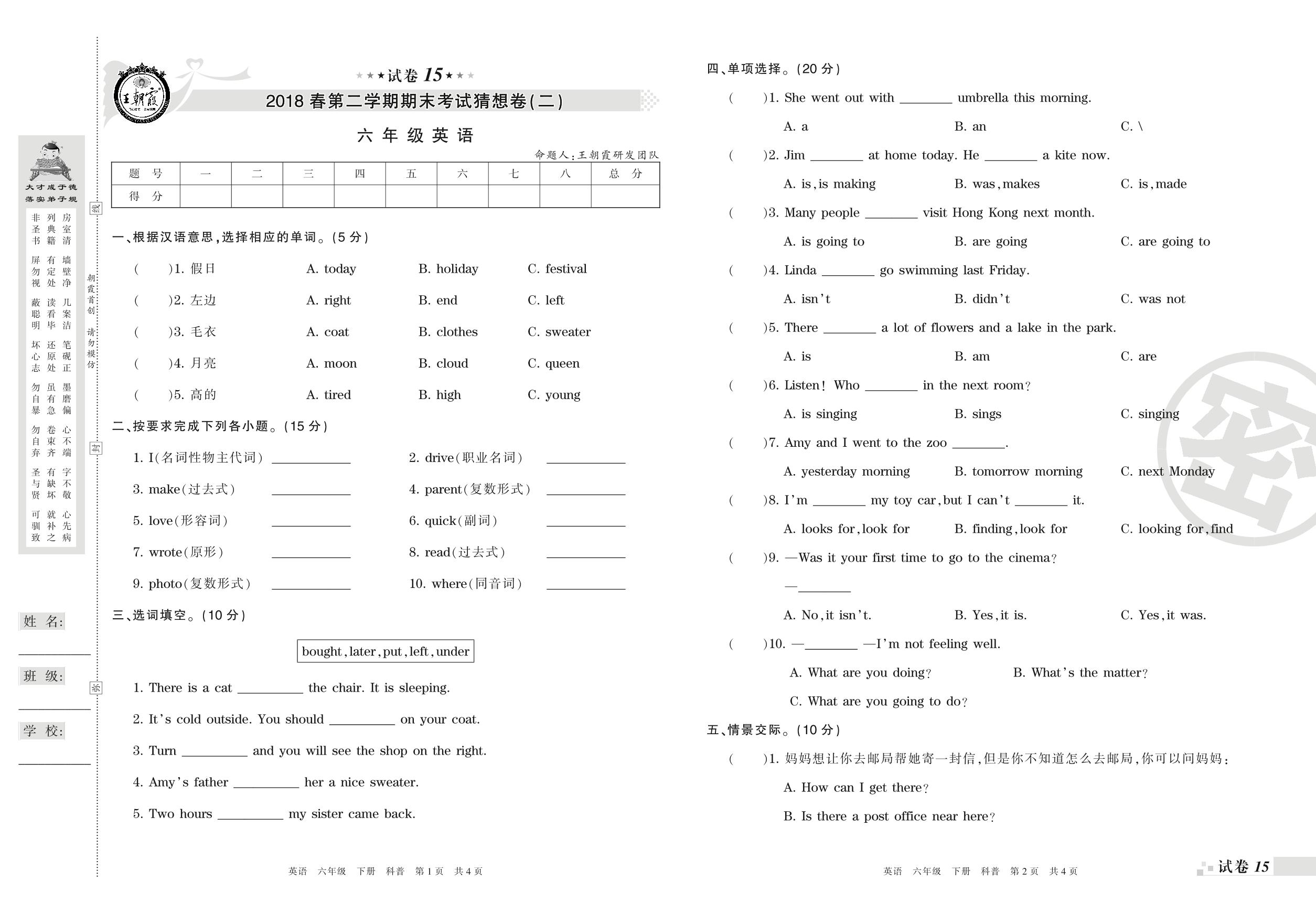 2017-2018学年第二学期期末考试猜想卷(二)六年级英语(科普版)【15】