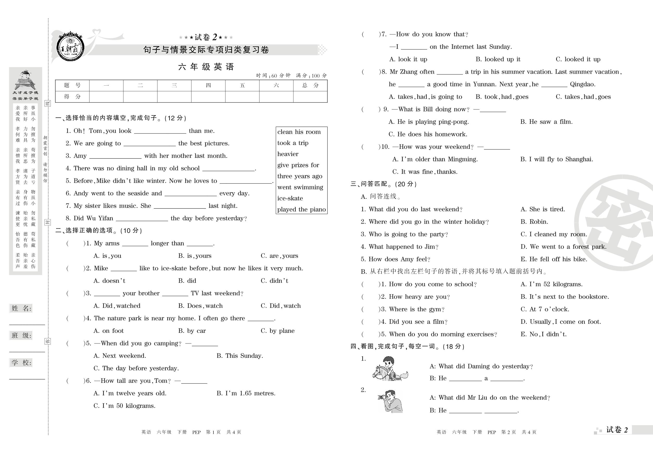 王朝霞期末专项卷——句子与情景交际专项归类复习卷六年级下册英语(PEP版)_R220123113640632【2】
