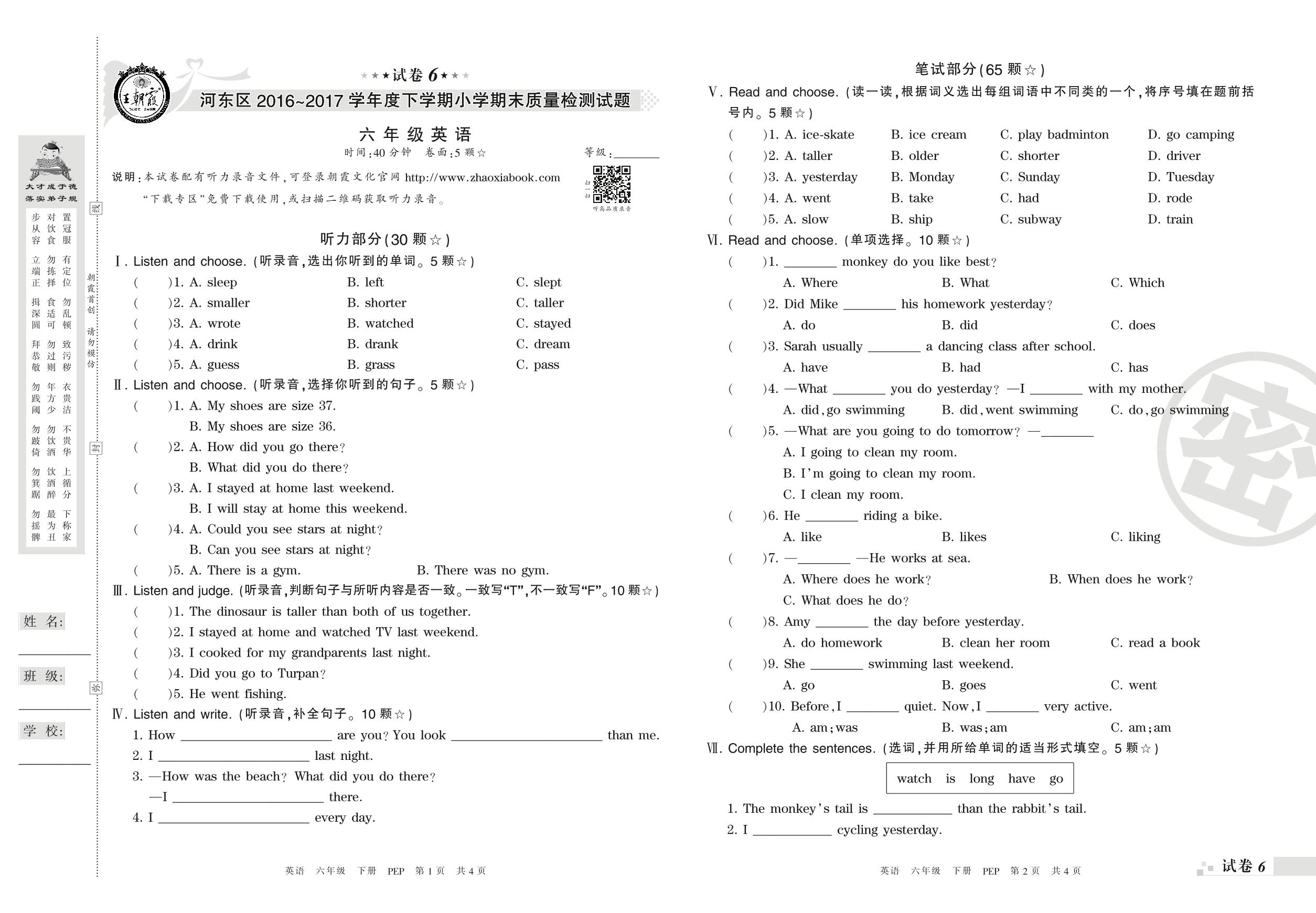 2016-2017学年第二学期临沂市河东区六年级英语试卷(PEP版)【6】