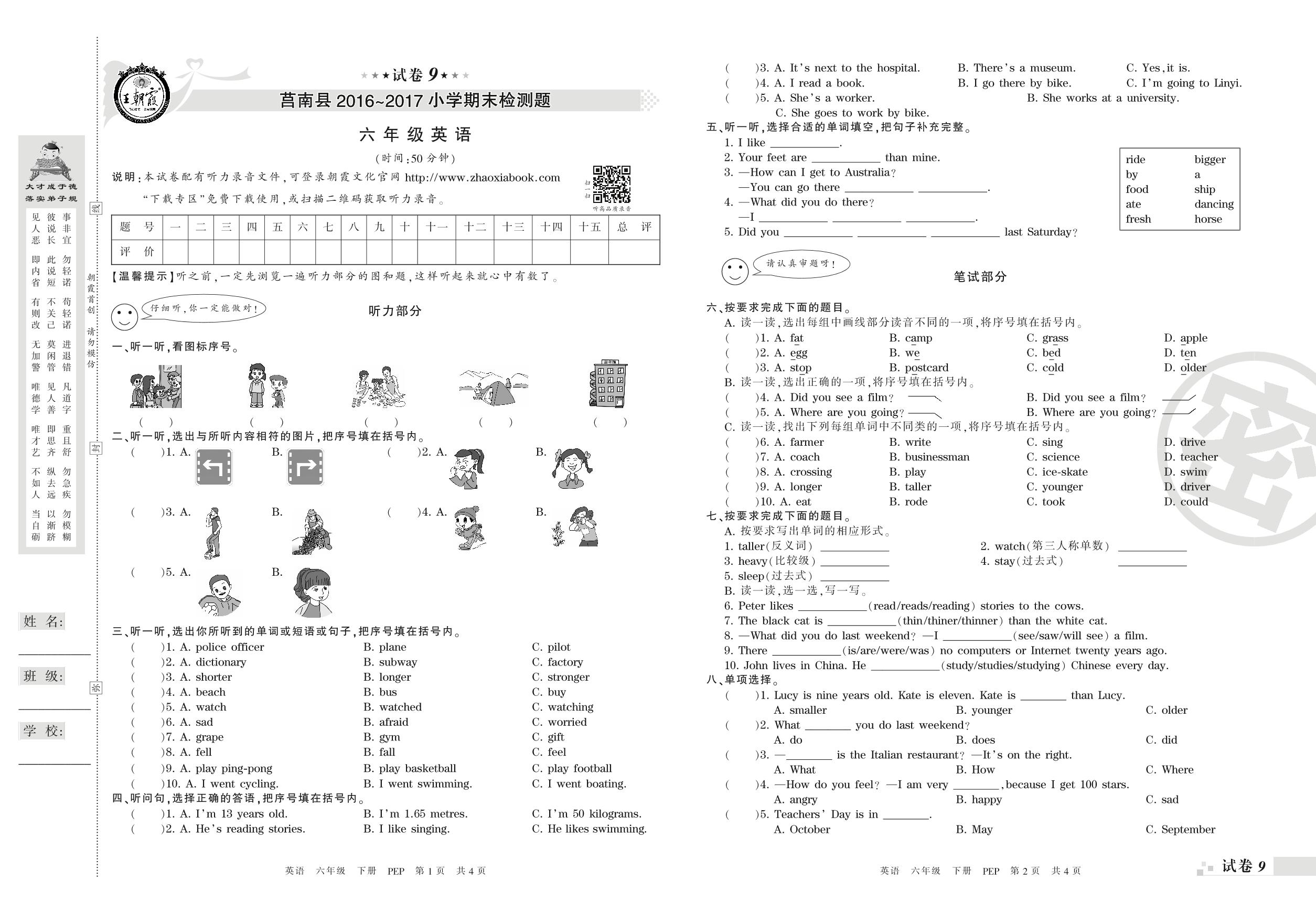 2016-2017学年第二学期临沂市莒南县六年级英语试卷(PEP版)【9】