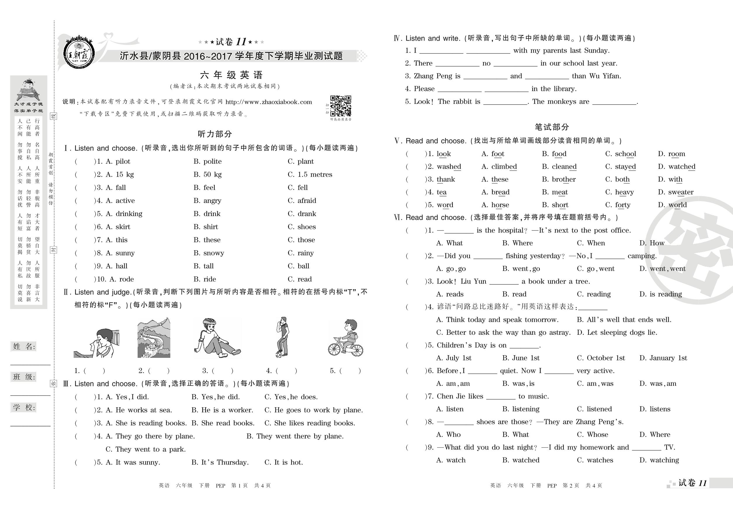 2016-2017学年第二学期临沂市沂水县、蒙阴县六年级英语试卷(PEP版)【11】