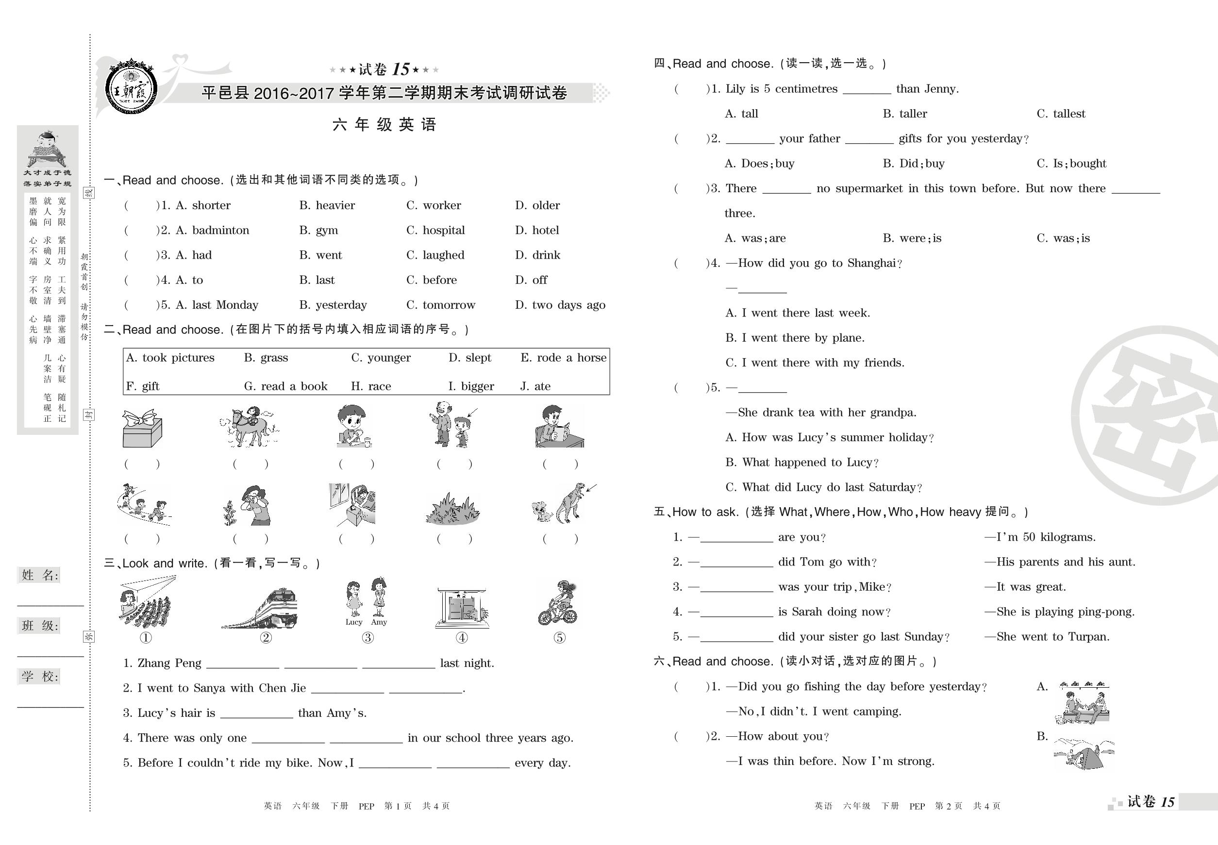 2016-2017学年第二学期临沂市平邑县六年级英语试卷(PEP版)【15】