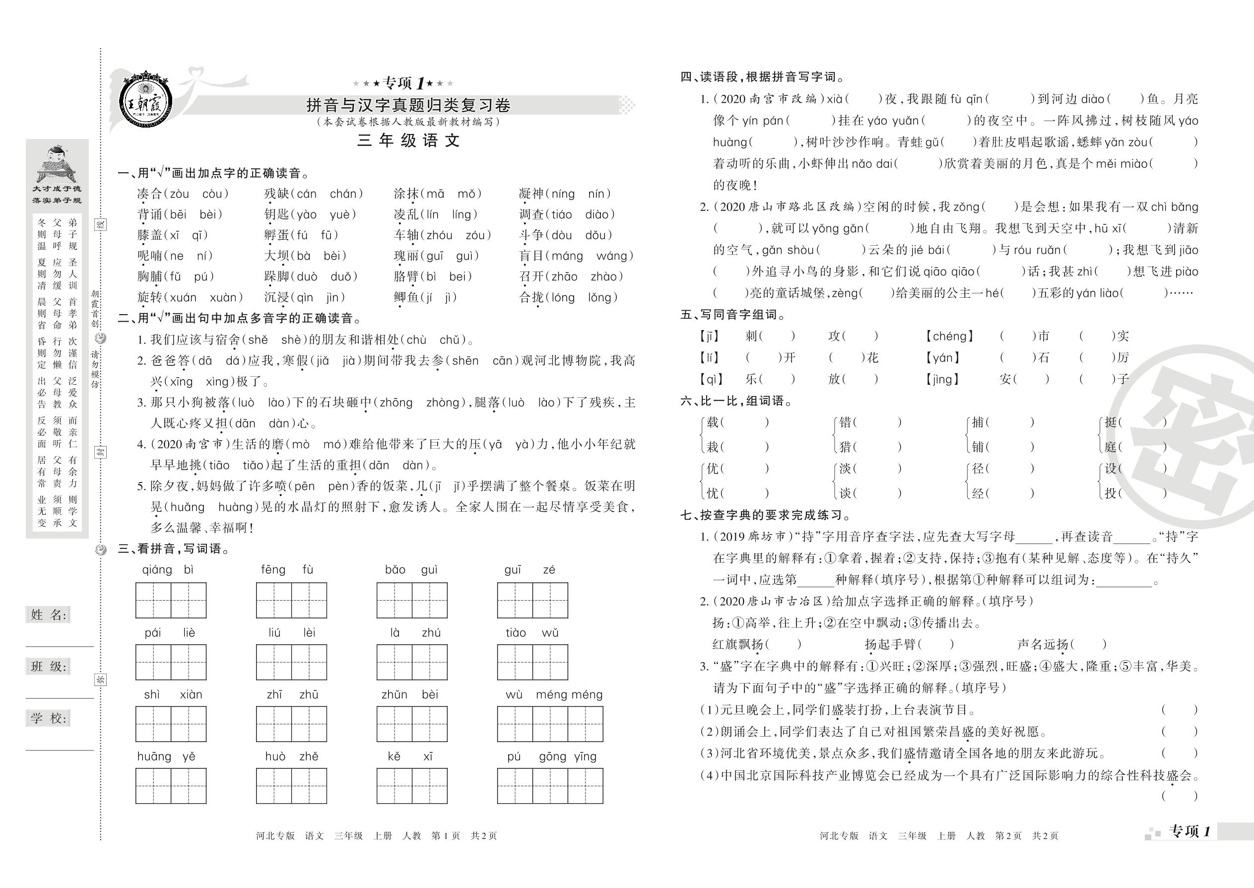 王朝霞期末专项卷——拼音与汉字、词语真题归类复习三年级上册语文(人教版)_R21080184910【0】