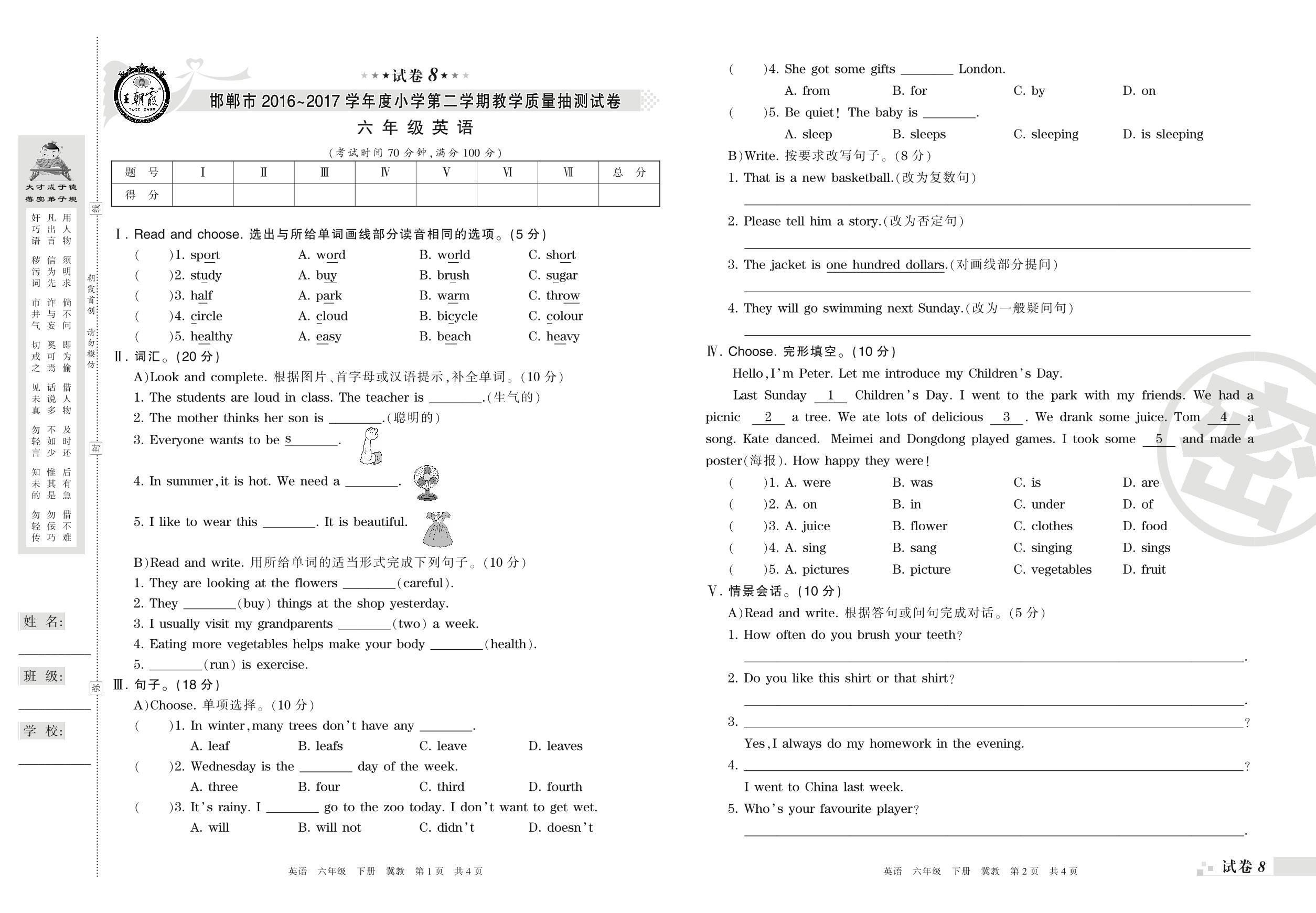 2016-2017学年第二学期邯郸市六年级英语试卷(冀教版)【8】