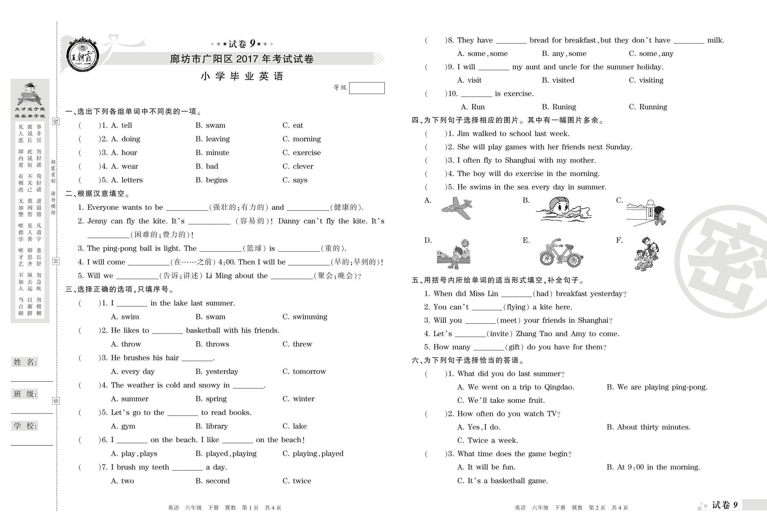 2016-2017学年第二学期廊坊市广阳区六年级英语试卷(冀教版)【9】
