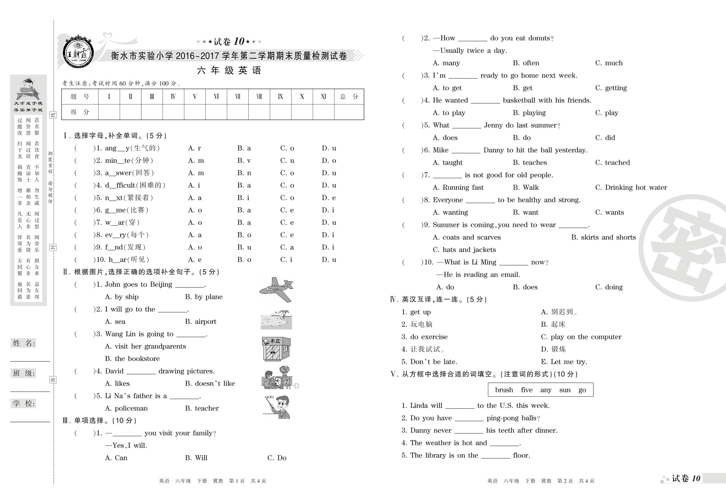 2016-2017学年第二学期衡水市实验小学六年级英语试卷(冀教版)【10】