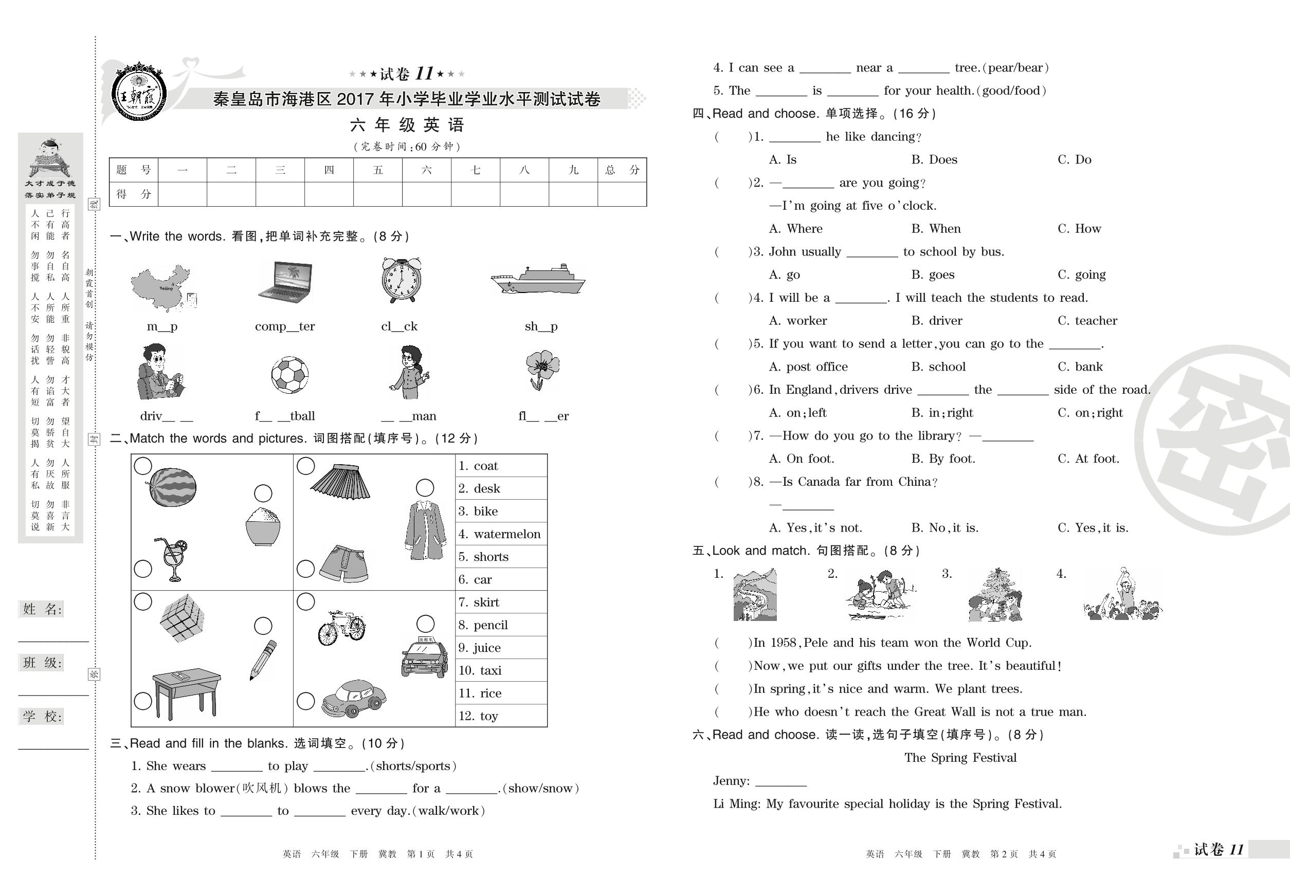 2016-2017学年第二学期秦皇岛市海港区六年级英语试卷(冀教版)【11】