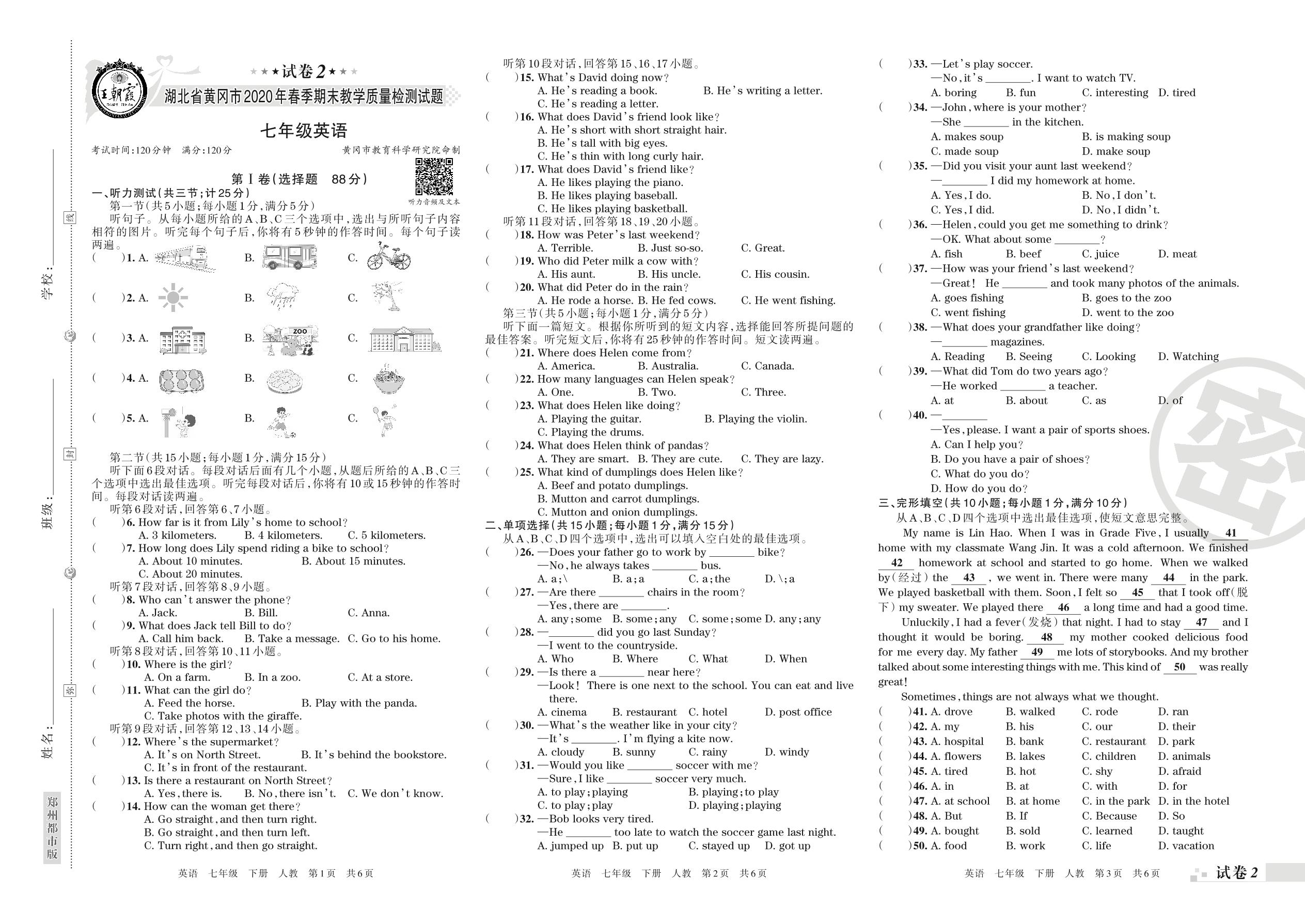 2019-2020学年第二学期湖北省黄冈市七年级英语试卷(人教版)【2】