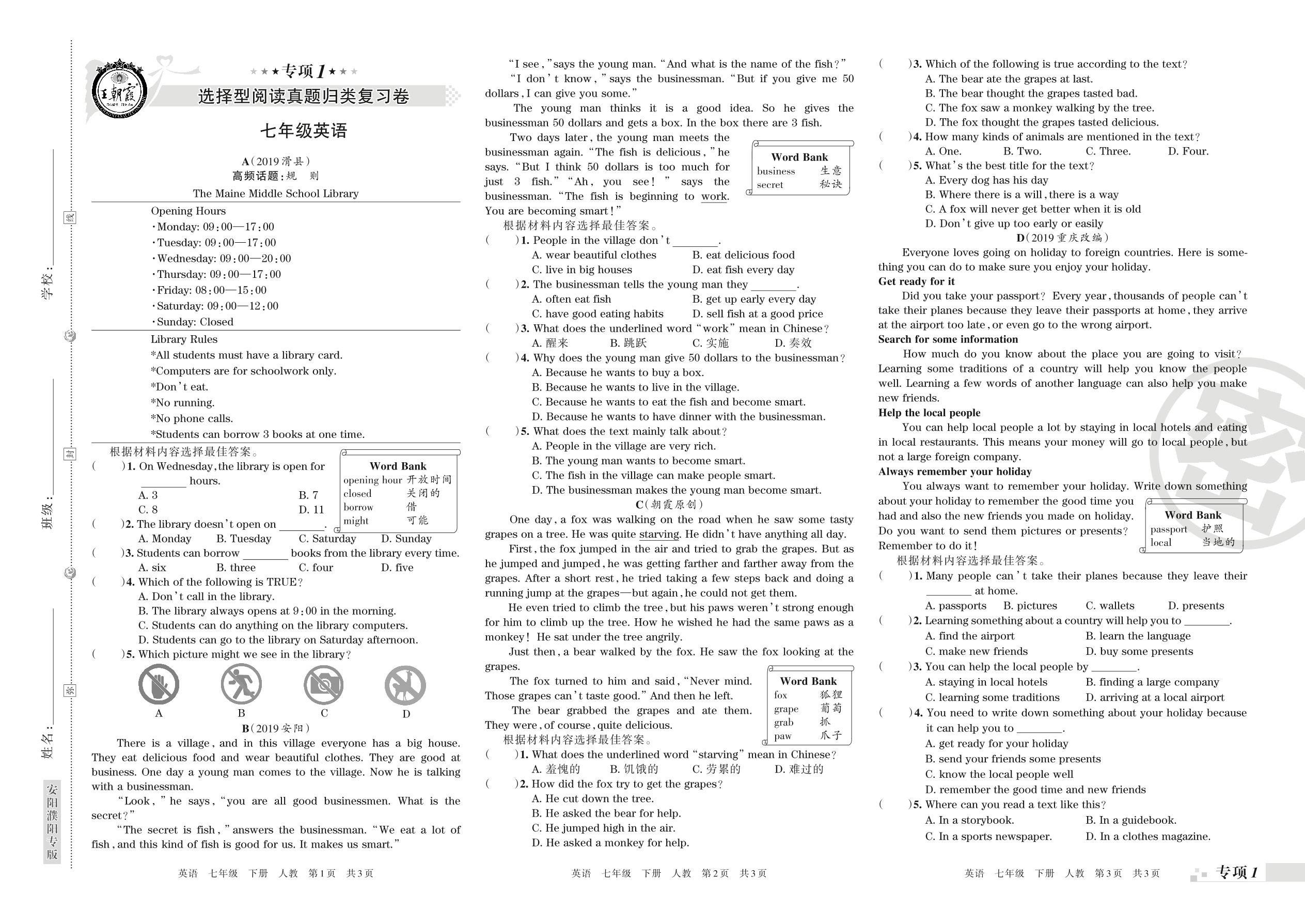 王朝霞期末专项卷——选择型阅读、任务型阅读真题归类复习七年级下册英语(人教版)【0】