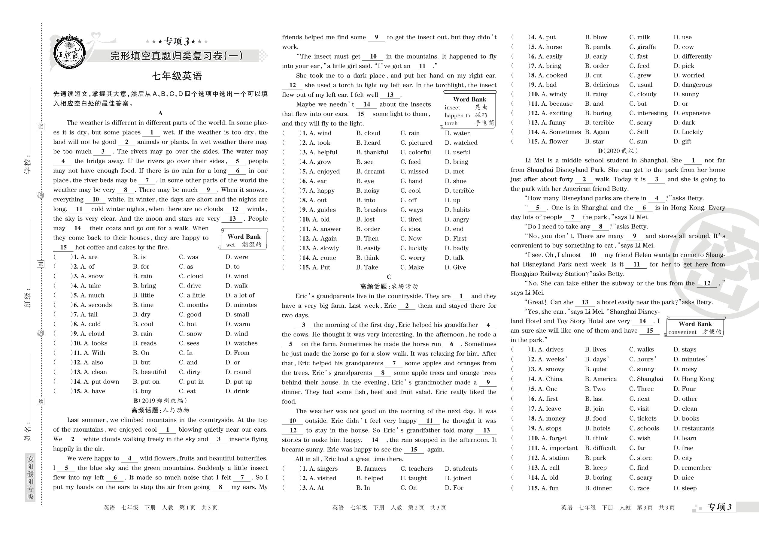 王朝霞期末专项卷——完形填空(一)、(二)真题归类复习七年级下册英语(人教版)【0】