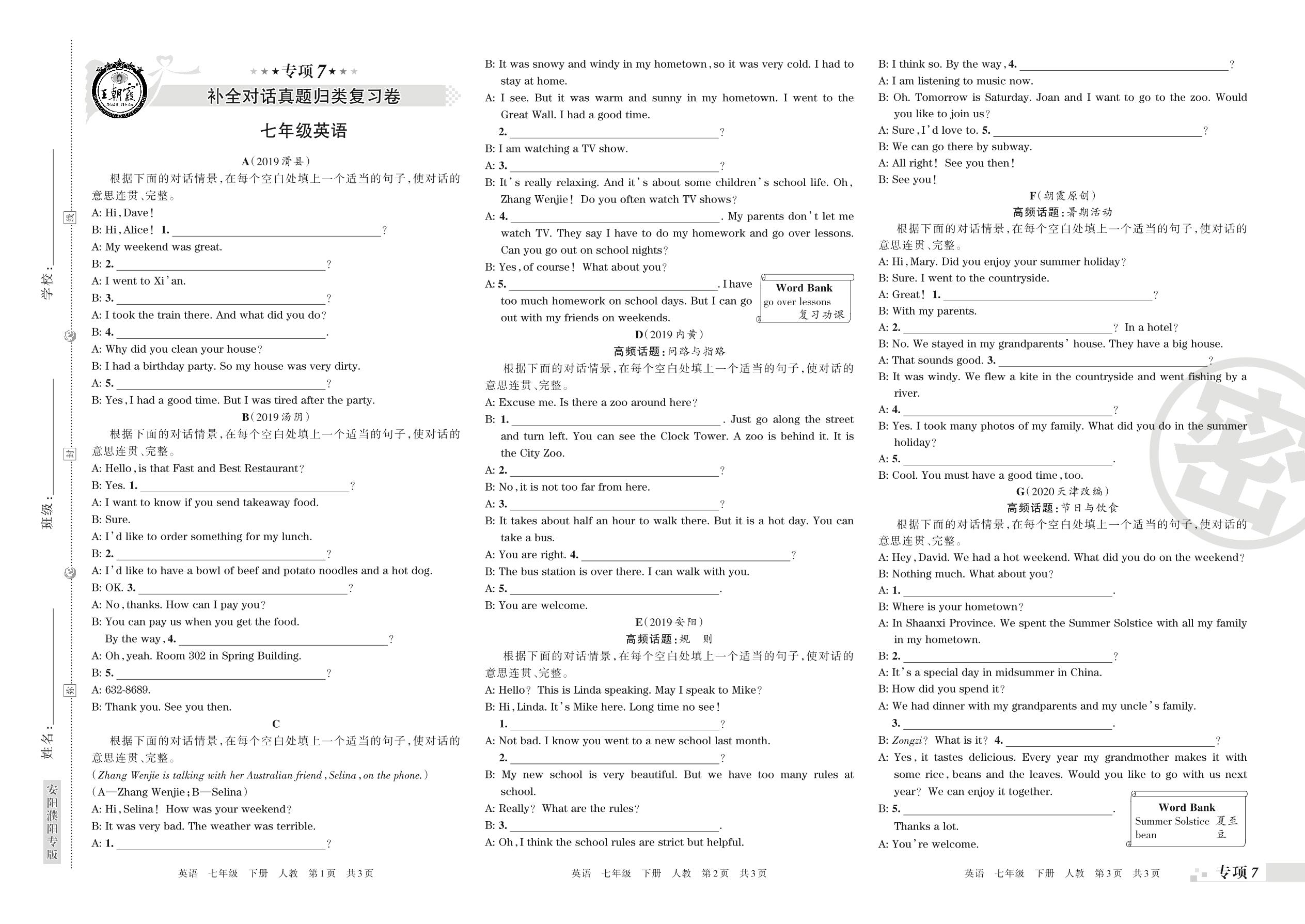 王朝霞期末专项卷——补全对话、书面表达真题归类复习七年级下册英语(人教版)【0】